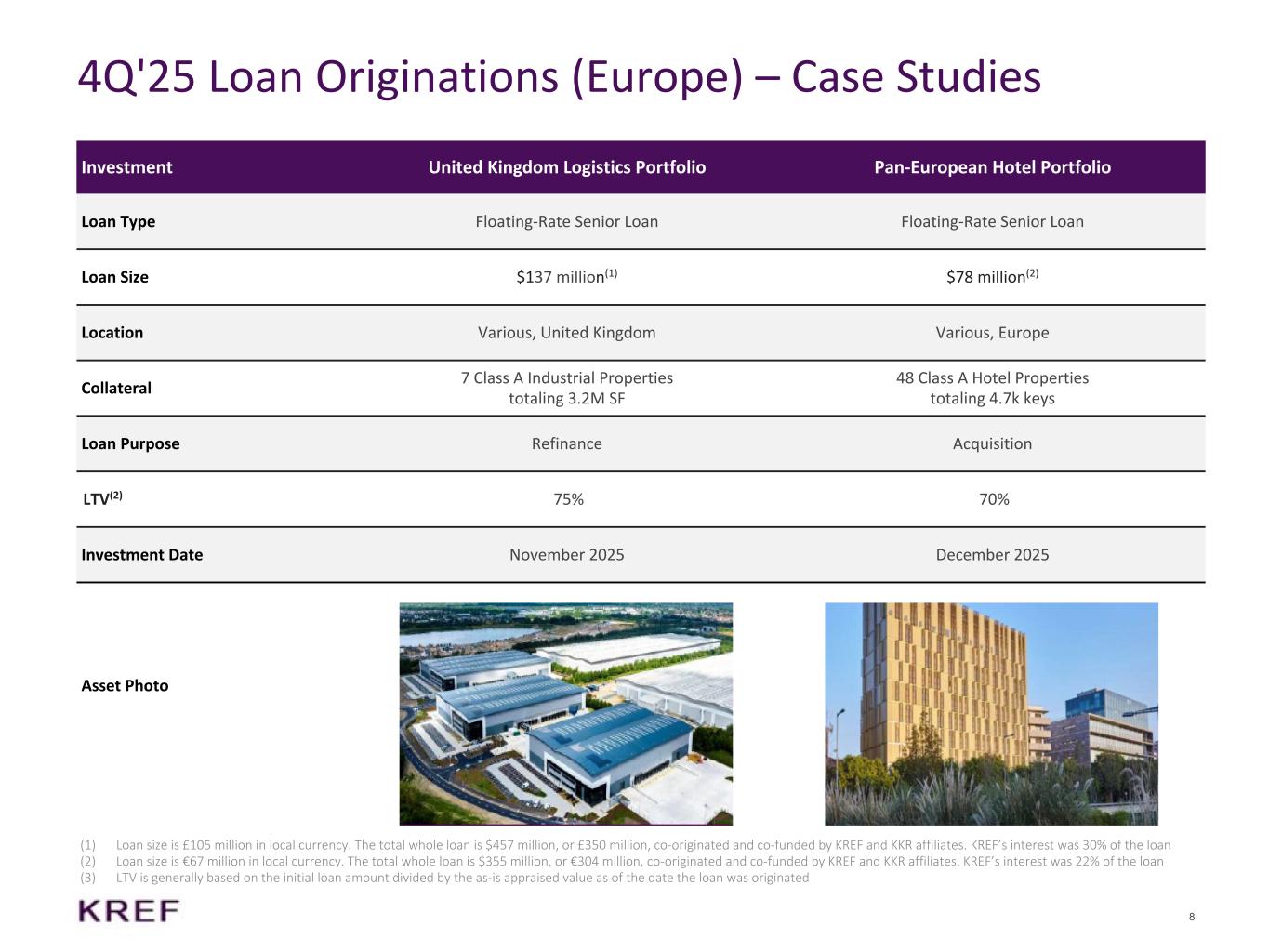 7 4Q'25 Loan Originations (U.S.) – Case Studies Investment Dallas Office New Jersey Multifamily Loan Type Floating-Rate Senior Loan Floating-Rate Senior Loan Loan Size $114 million(1) $95 million(2) Location Dallas, TX Jersey City, NJ Collateral 505k RSF Class A Office Property 417-Unit Class A Multifamily Rental Property Loan Purpose Refinance Acquisition LTV(3) 52% 76% Investment Date November 2025 October 2025 Asset Photo (1) The total whole loan is $228 million, co-originated and co-funded by KREF and KKR affiliates. KREF’s interest was 50% of the loan (2) The total whole loan is $190 million, co-originated and co-funded by KREF and KKR affiliates. KREF’s interest was 50% of the loan (3) LTV is generally based on the initial loan amount divided by the as-is appraised value as of the date the loan was originated