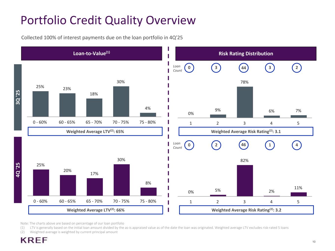 9 Multifamily 40% Office 23% Industrial 18% Life Science 14% Hospitality 3% Other 2% Class-A 82% Class-B 18% KREF Loan Portfolio by the Numbers (1) Includes loans, real estate assets, CMBS and other investments (2) KREF classifies a loan as life science if more than 50% of the gross leasable area is leased to, or will be converted to, life science-related space (3) “Other” property types include: 2% Student Housing and <1% Mixed Use (4) Office property certification % is based on current principal loan balance; see description for LEED certification in the Appendix Geography Investment Type Property Type Interest Rate TypeTotal Portfolio(1) 4% 11% 12% 17% 12% Other U.S <4%: 20% ($ in Millions) 100% Office(4) 5% Washington, D.C. $6,792 $7,916 $7,752 $6,272 $5,924 4Q'21 4Q'22 4Q'23 4Q'24 4Q'25 Senior Loans 100% Floating 99% Fixed 1% Multifamily Class-A 91% Class-B 9% (3) 6% 4% 5% Europe: 4% (2)