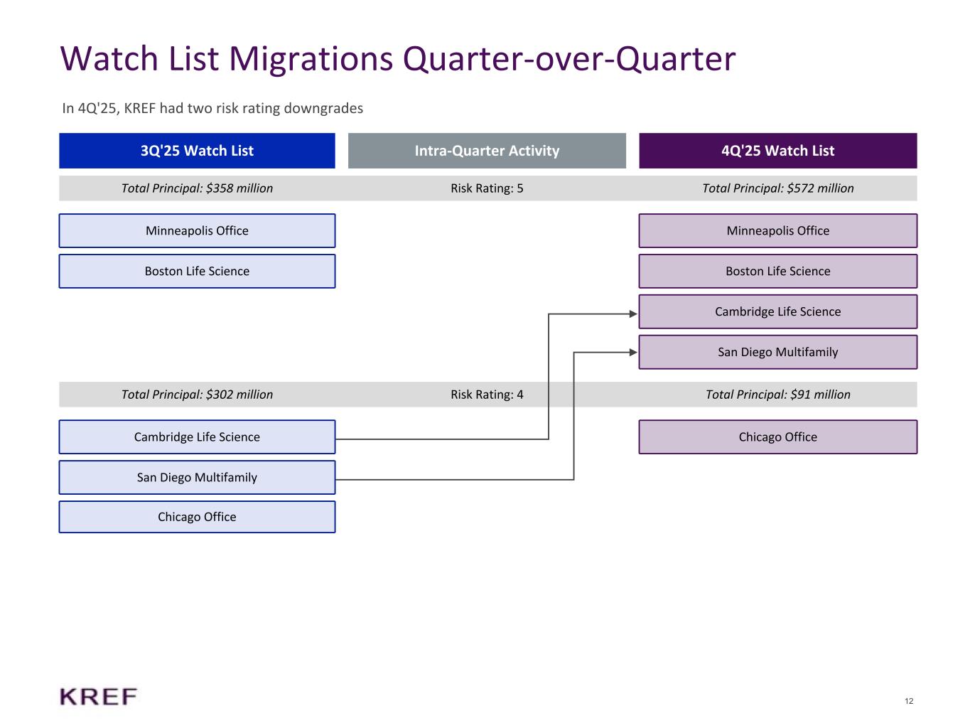 11 KREF Life Science Loan Portfolio Overview 100% of KREF's loan exposure is located in the top two Life Science markets Location MSA Investment Date Loan Purpose Development Status Year Built or Renovated Asset Quality Committed Principal Outstanding Principal Net Equity Loan per SF(1) Max Term (Years)(2) Boston, MA Boston Apr-21 Acquisition Complete 2022 Class A/B $166.2 $164.1 $62.5 $681 0.1 Cambridge, MA Boston Dec-21 Construction Complete 2023 Class A 115.7 99.0 39.7 1,072 1.0 Risk-Rated 5: Total / Weighted Average $281.9 $263.1 $102.2 0.4 Boston, MA(3) Boston Aug-22 Construction Complete 2024 Class A 312.5 229.6 34.0 747 1.6 Redwood City, CA San Francisco Sep-22 Construction In Process 2025 Class A 145.2 100.1 19.8 886 1.8 San Carlos, CA San Francisco Feb-22 Recapitalization Complete 2023 Class A 89.1 61.6 23.1 420 1.9 Brisbane, CA San Francisco Jul-21 Refinance N/A 2020 Class A 88.3 80.8 23.6 698 2.6 Risk-Rated 3: Total / Weighted Average $635.1 $472.1 $100.5 1.9 Grand Total / Weighted Average $917.0 $735.2 $202.7 1.4 Completed 74% In Process 16% N/A 10% Boston 65% San Francisco 35% Life Science Assets Development Status(4) Metropolitan Statistical Area(4) Note: Amounts shown in millions, except for Loan per SF (1) Loan Per SF based on current principal amount divided by current SF. For Construction loans, Loan per SF based on total commitment amount of the loan divided by the proposed SF (2) Max remaining term (years) assumes all extension options are exercised, if applicable. Weighted average is weighted by current principal amount (3) KREF expects to downgrade the loan in the first quarter of 2026 based on discussions with the borrower; the resulting increase in the CECL reserve cannot be reasonably estimated at this time (4) Based on committed principal