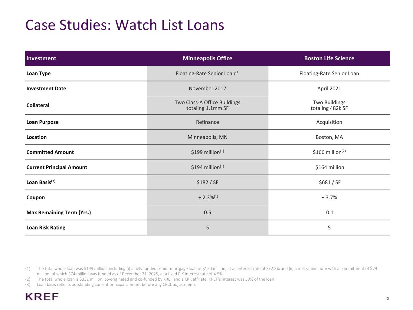 12 3Q'25 Watch List Intra-Quarter Activity 4Q'25 Watch List Total Principal: $358 million Risk Rating: 5 Total Principal: $572 million Minneapolis Office Minneapolis Office Boston Life Science Boston Life Science Cambridge Life Science San Diego Multifamily Total Principal: $302 million Risk Rating: 4 Total Principal: $91 million Cambridge Life Science Chicago Office San Diego Multifamily Chicago Office Watch List Migrations Quarter-over-Quarter In 4Q'25, KREF had two risk rating downgrades