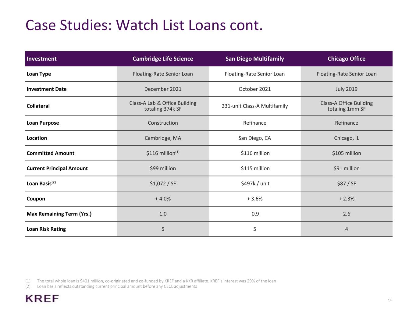 13 Case Studies: Watch List Loans Investment Minneapolis Office Boston Life Science Loan Type Floating-Rate Senior Loan(1) Floating-Rate Senior Loan Investment Date November 2017 April 2021 Collateral Two Class-A Office Buildings totaling 1.1mm SF Two Buildings totaling 482k SF Loan Purpose Refinance Acquisition Location Minneapolis, MN Boston, MA Committed Amount $199 million(1) $166 million(2) Current Principal Amount $194 million(1) $164 million Loan Basis(3) $182 / SF $681 / SF Coupon + 2.3%(1) + 3.7% Max Remaining Term (Yrs.) 0.5 0.1 Loan Risk Rating 5 5 (1) The total whole loan was $199 million, including (i) a fully funded senior mortgage loan of $120 million, at an interest rate of S+2.3% and (ii) a mezzanine note with a commitment of $79 million, of which $74 million was funded as of December 31, 2025, at a fixed PIK interest rate of 4.5% (2) The total whole loan is $332 million, co-originated and co-funded by KREF and a KKR affiliate. KREF’s interest was 50% of the loan (3) Loan basis reflects outstanding current principal amount before any CECL adjustments