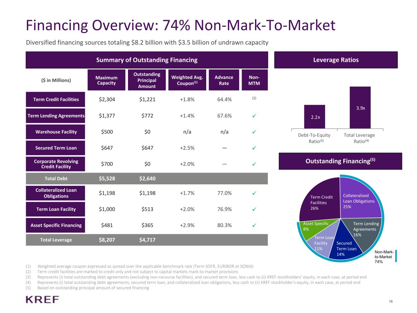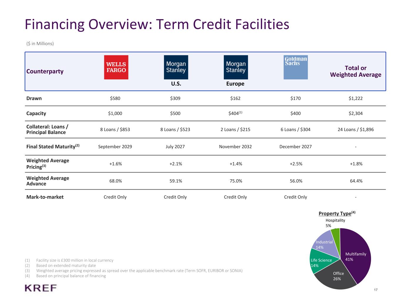 16 Collateralized Loan Obligations 25% Term Lending Agreements 16% Secured Term Loan 14% Term Loan Facility 11% Asset Specific 8% Term Credit Facilities 26% Financing Overview: 74% Non-Mark-To-Market Diversified financing sources totaling $8.2 billion with $3.5 billion of undrawn capacity Summary of Outstanding Financing Leverage Ratios (3) Outstanding Financing(5) ($ in Millions) Maximum Capacity Outstanding Principal Amount Weighted Avg. Coupon(1) Advance Rate Non- MTM Term Credit Facilities $2,304 $1,221 +1.8% 64.4% (2) Term Lending Agreements $1,377 $772 +1.4% 67.6% ü Warehouse Facility $500 $0 n/a n/a ü Secured Term Loan $647 $647 +2.5% — ü Corporate Revolving Credit Facility $700 $0 +2.0% — ü Total Debt $5,528 $2,640 Collateralized Loan Obligations $1,198 $1,198 +1.7% 77.0% ü Term Loan Facility $1,000 $513 +2.0% 76.9% ü Asset Specific Financing $481 $365 +2.9% 80.3% ü Total Leverage $8,207 $4,717 2.2 3.9 Debt-To-Equity Ratio Total Leverage Ratio(4) x (1) Weighted average coupon expressed as spread over the applicable benchmark rate (Term SOFR, EURIBOR or SONIA) (2) Term credit facilities are marked to credit only and not subject to capital markets mark-to-market provisions (3) Represents (i) total outstanding debt agreements (excluding non-recourse facilities), and secured term loan, less cash to (ii) KREF stockholders' equity, in each case, at period end (4) Represents (i) total outstanding debt agreements, secured term loan, and collateralized loan obligations, less cash to (ii) KREF stockholder's equity, in each case, at period end (5) Based on outstanding principal amount of secured financing Non-Mark- to-Market 74% x