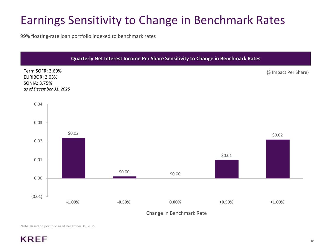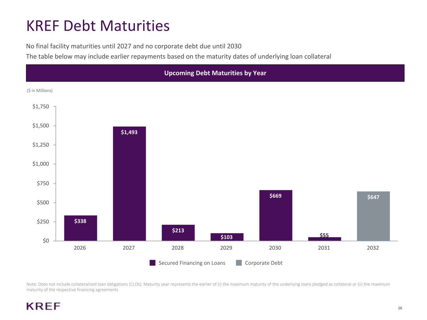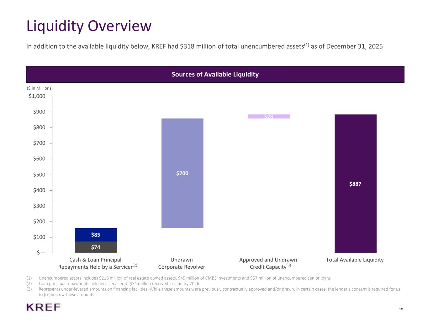 18 $74 $159 $859 $85 $700 $28 $887 Cash & Loan Principal Repayments Held by a Servicer Undrawn Corporate Revolver Approved and Undrawn Credit Capacity Total Available Liquidity $— $100 $200 $300 $400 $500 $600 $700 $800 $900 $1,000 Liquidity Overview (1) Unencumbered assets includes $216 million of real estate owned assets, $45 million of CMBS investments and $57 million of unencumbered senior loans (2) Loan principal repayments held by a servicer of $74 million received in January 2026 (3) Represents under-levered amounts on financing facilities. While these amounts were previously contractually approved and/or drawn, in certain cases, the lender’s consent is required for us to (re)borrow these amounts ($ in Millions) Sources of Available Liquidity In addition to the available liquidity below, KREF had $318 million of total unencumbered assets(1) as of December 31, 2025 (4) (3)(2)