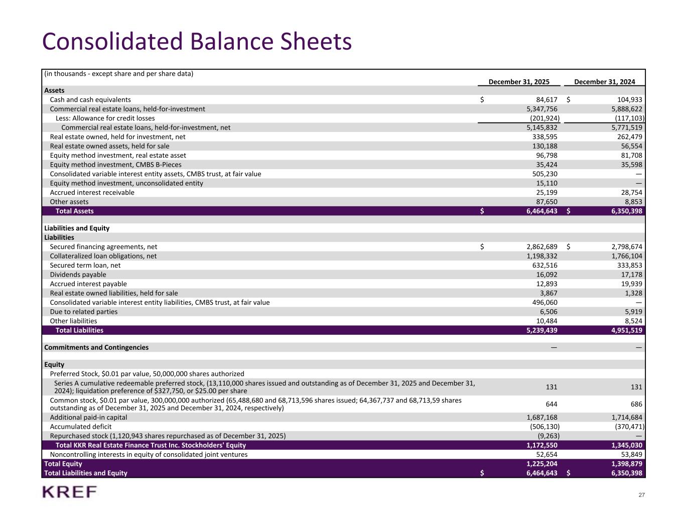 27 Consolidated Balance Sheets (in thousands - except share and per share data) December 31, 2025 December 31, 2024 Assets Cash and cash equivalents $ 84,617 $ 104,933 Commercial real estate loans, held-for-investment 5,347,756 5,888,622 Less: Allowance for credit losses (201,924) (117,103) Commercial real estate loans, held-for-investment, net 5,145,832 5,771,519 Real estate owned, held for investment, net 338,595 262,479 Real estate owned assets, held for sale 130,188 56,554 Equity method investment, real estate asset 96,798 81,708 Equity method investment, CMBS B-Pieces 35,424 35,598 Consolidated variable interest entity assets, CMBS trust, at fair value 505,230 — Equity method investment, unconsolidated entity 15,110 — Accrued interest receivable 25,199 28,754 Other assets 87,650 8,853 Total Assets $ 6,464,643 $ 6,350,398 Liabilities and Equity Liabilities Secured financing agreements, net $ 2,862,689 $ 2,798,674 Collateralized loan obligations, net 1,198,332 1,766,104 Secured term loan, net 632,516 333,853 Dividends payable 16,092 17,178 Accrued interest payable 12,893 19,939 Real estate owned liabilities, held for sale 3,867 1,328 Consolidated variable interest entity liabilities, CMBS trust, at fair value 496,060 — Due to related parties 6,506 5,919 Other liabilities 10,484 8,524 Total Liabilities 5,239,439 4,951,519 Commitments and Contingencies — — Equity Preferred Stock, $0.01 par value, 50,000,000 shares authorized Series A cumulative redeemable preferred stock, (13,110,000 shares issued and outstanding as of December 31, 2025 and December 31, 2024); liquidation preference of $327,750, or $25.00 per share 131 131 Common stock, $0.01 par value, 300,000,000 authorized (65,488,680 and 68,713,596 shares issued; 64,367,737 and 68,713,59 shares outstanding as of December 31, 2025 and December 31, 2024, respectively) 644 686 Additional paid-in capital 1,687,168 1,714,684 Accumulated deficit (506,130) (370,471) Repurchased stock (1,120,943 shares repurchased as of December 31, 2025) (9,263) — Total KKR Real Estate Finance Trust Inc. Stockholders' Equity 1,172,550 1,345,030 Noncontrolling interests in equity of consolidated joint ventures 52,654 53,849 Total Equity 1,225,204 1,398,879 Total Liabilities and Equity $ 6,464,643 $ 6,350,398