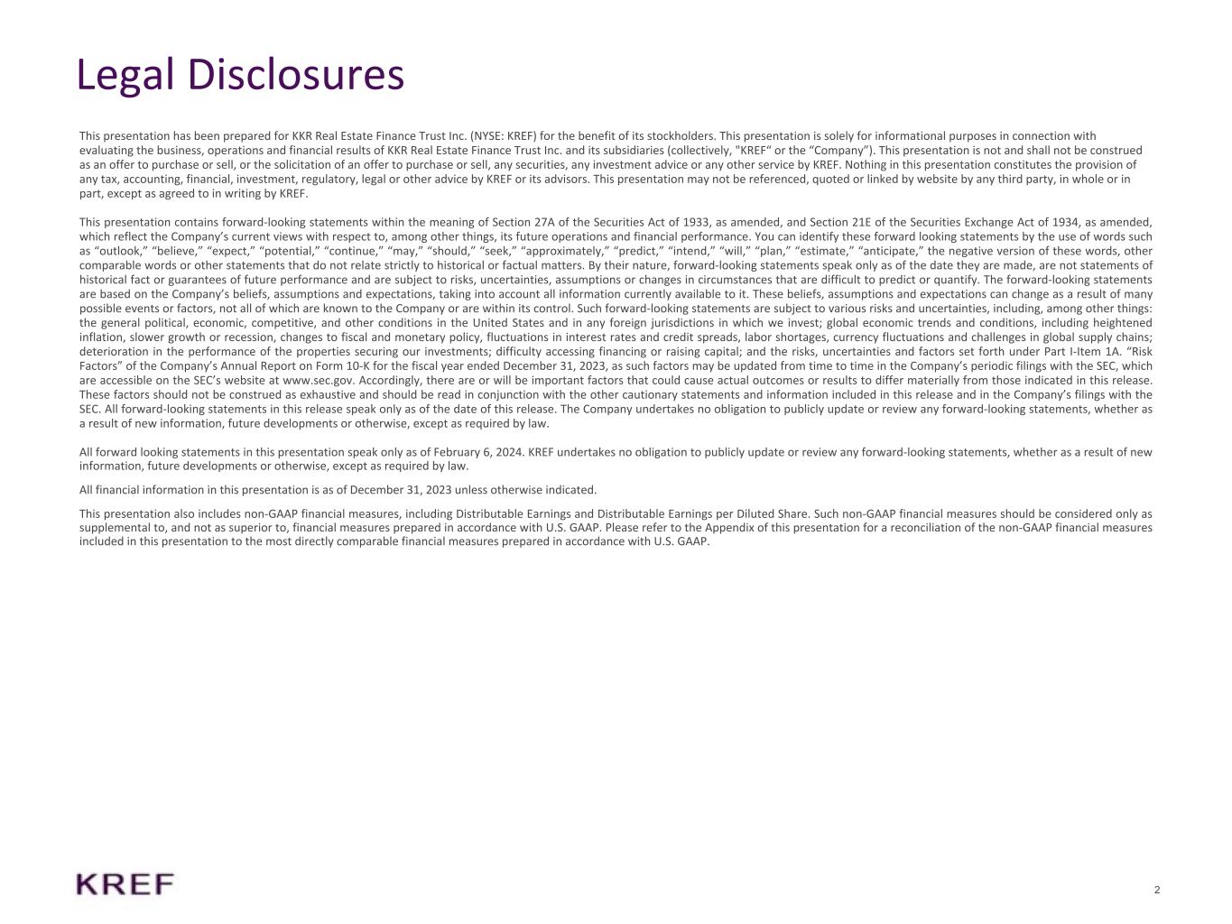 2 Legal Disclosures This presentation has been prepared for KKR Real Estate Finance Trust Inc. (NYSE: KREF) for the benefit of its stockholders. This presentation is solely for informational purposes in connection with evaluating the business, operations and financial results of KKR Real Estate Finance Trust Inc. and its subsidiaries (collectively, "KREF“ or the “Company”). This presentation is not and shall not be construed as an offer to purchase or sell, or the solicitation of an offer to purchase or sell, any securities, any investment advice or any other service by KREF. Nothing in this presentation constitutes the provision of any tax, accounting, financial, investment, regulatory, legal or other advice by KREF or its advisors. This presentation may not be referenced, quoted or linked by website by any third party, in whole or in part, except as agreed to in writing by KREF. This presentation contains forward-looking statements within the meaning of Section 27A of the Securities Act of 1933, as amended, and Section 21E of the Securities Exchange Act of 1934, as amended, which reflect the Company’s current views with respect to, among other things, its future operations and financial performance. You can identify these forward looking statements by the use of words such as “outlook,” “believe,” “expect,” “potential,” “continue,” “may,” “should,” “seek,” “approximately,” “predict,” “intend,” “will,” “plan,” “estimate,” “anticipate,” the negative version of these words, other comparable words or other statements that do not relate strictly to historical or factual matters. By their nature, forward-looking statements speak only as of the date they are made, are not statements of historical fact or guarantees of future performance and are subject to risks, uncertainties, assumptions or changes in circumstances that are difficult to predict or quantify. The forward-looking statements are based on the Company’s beliefs, assumptions and expectations, taking into account all information currently available to it. These beliefs, assumptions and expectations can change as a result of many possible events or factors, not all of which are known to the Company or are within its control. Such forward-looking statements are subject to various risks and uncertainties, including, among other things: the general political, economic, competitive, and other conditions in the United States and in any foreign jurisdictions in which we invest; global economic trends and conditions, including heightened inflation, slower growth or recession, changes to fiscal and monetary policy, fluctuations in interest rates and credit spreads, labor shortages, currency fluctuations and challenges in global supply chains; deterioration in the performance of the properties securing our investments; difficulty accessing financing or raising capital; and the risks, uncertainties and factors set forth under Part I-Item 1A. “Risk Factors” of the Company’s Annual Report on Form 10-K for the fiscal year ended December 31, 2023, as such factors may be updated from time to time in the Company’s periodic filings with the SEC, which are accessible on the SEC’s website at www.sec.gov. Accordingly, there are or will be important factors that could cause actual outcomes or results to differ materially from those indicated in this release. These factors should not be construed as exhaustive and should be read in conjunction with the other cautionary statements and information included in this release and in the Company’s filings with the SEC. All forward-looking statements in this release speak only as of the date of this release. The Company undertakes no obligation to publicly update or review any forward-looking statements, whether as a result of new information, future developments or otherwise, except as required by law. All forward looking statements in this presentation speak only as of February 6, 2024. KREF undertakes no obligation to publicly update or review any forward-looking statements, whether as a result of new information, future developments or otherwise, except as required by law. All financial information in this presentation is as of December 31, 2023 unless otherwise indicated. This presentation also includes non-GAAP financial measures, including Distributable Earnings and Distributable Earnings per Diluted Share. Such non-GAAP financial measures should be considered only as supplemental to, and not as superior to, financial measures prepared in accordance with U.S. GAAP. Please refer to the Appendix of this presentation for a reconciliation of the non-GAAP financial measures included in this presentation to the most directly comparable financial measures prepared in accordance with U.S. GAAP.