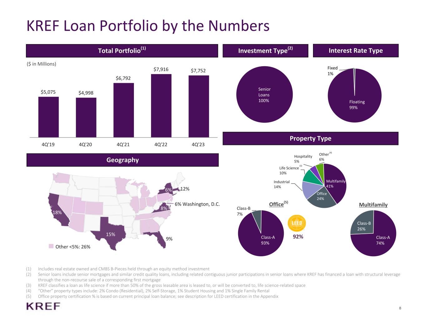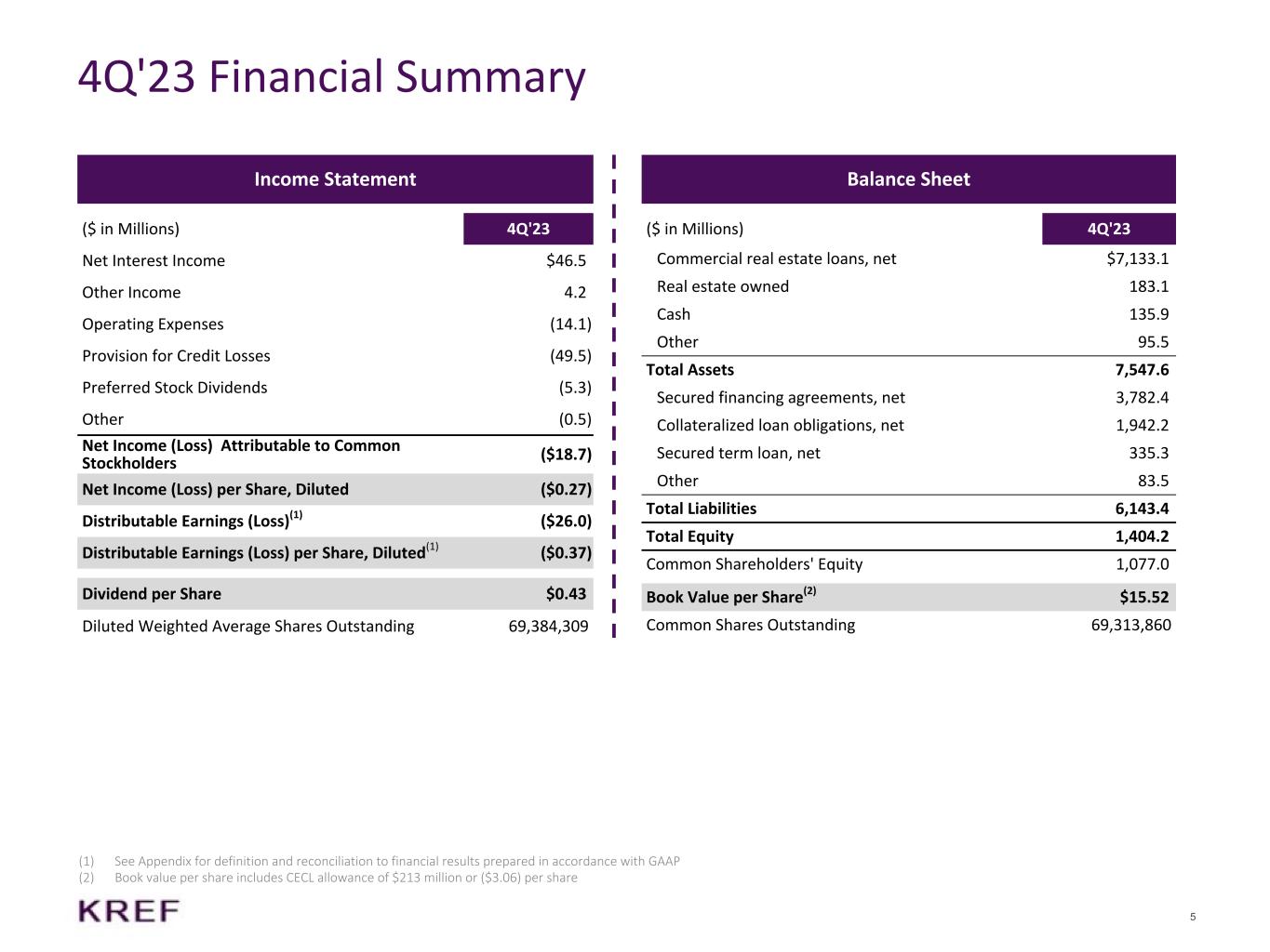 4 • 4Q and full year 2023 Net Income (Loss)(1) of ($0.27) and ($0.78) per diluted share (includes a CECL provision of $50 million and $175 million, or ($0.71) and ($2.53) per diluted share, respectively) • 4Q and full year Distributable Earnings (Loss)(2) of ($0.37) and $0.83 per diluted share (includes write-offs of $59 million and $74 million, or ($0.85) and ($1.07) per diluted share, respectively) • Book Value per Share (“BVPS”) of $15.52 per share, compared to $16.29 per share as of 3Q'23 (includes a CECL allowance of $213 million, or ($3.06) per share as of December 31, 2023, representing 288 basis points of loan principal balance) • The Company’s Board of Directors declared a dividend of $0.25 per share of common stock with respect to the first quarter of 2024. The dividend is payable on April 15, 2024 to KREF’s common stockholders of record as of March 28, 2024 Fourth Quarter and Full Year 2023 Highlights (1) Represents Net Income or loss attributable to common stockholders (2) See Appendix for definition and reconciliation to financial results prepared in accordance with GAAP (3) Includes the amortization of deferred origination fees, loan origination costs and purchase discounts, and excludes loans accounted for under the cost recovery method • $7.8 billion predominantly senior loan portfolio with a weighted average unlevered all-in yield(3) of 9.0% • Multifamily and industrial assets represent 55% of loan portfolio • Weighted average risk rating of 3.2 • Funded $139 million and $684 million for loans closed in previous years in 4Q and during the full year 2023 • Received $188 million and $767 million in loan repayments in 4Q and during the full year 2023 • Collected 98% of interest payments during 2023 • Monitoring seven watch list loans, including three office assets Financials Portfolio Liquidity & Capitalization • $630 million of available liquidity, including $136 million of cash and $450 million undrawn capacity on the corporate revolver • Diversified financing sources totaling $8.9 billion with $2.8 billion of undrawn capacity • 76% of secured financing is fully non-mark-to-market and the remaining balance is mark-to-credit only • Upsized a $240 million term credit facility to $400 million and extended the final maturity date to December 2027 • Repaid $144 million convertible notes in cash • No corporate debt or final facility maturities due until 1Q'26