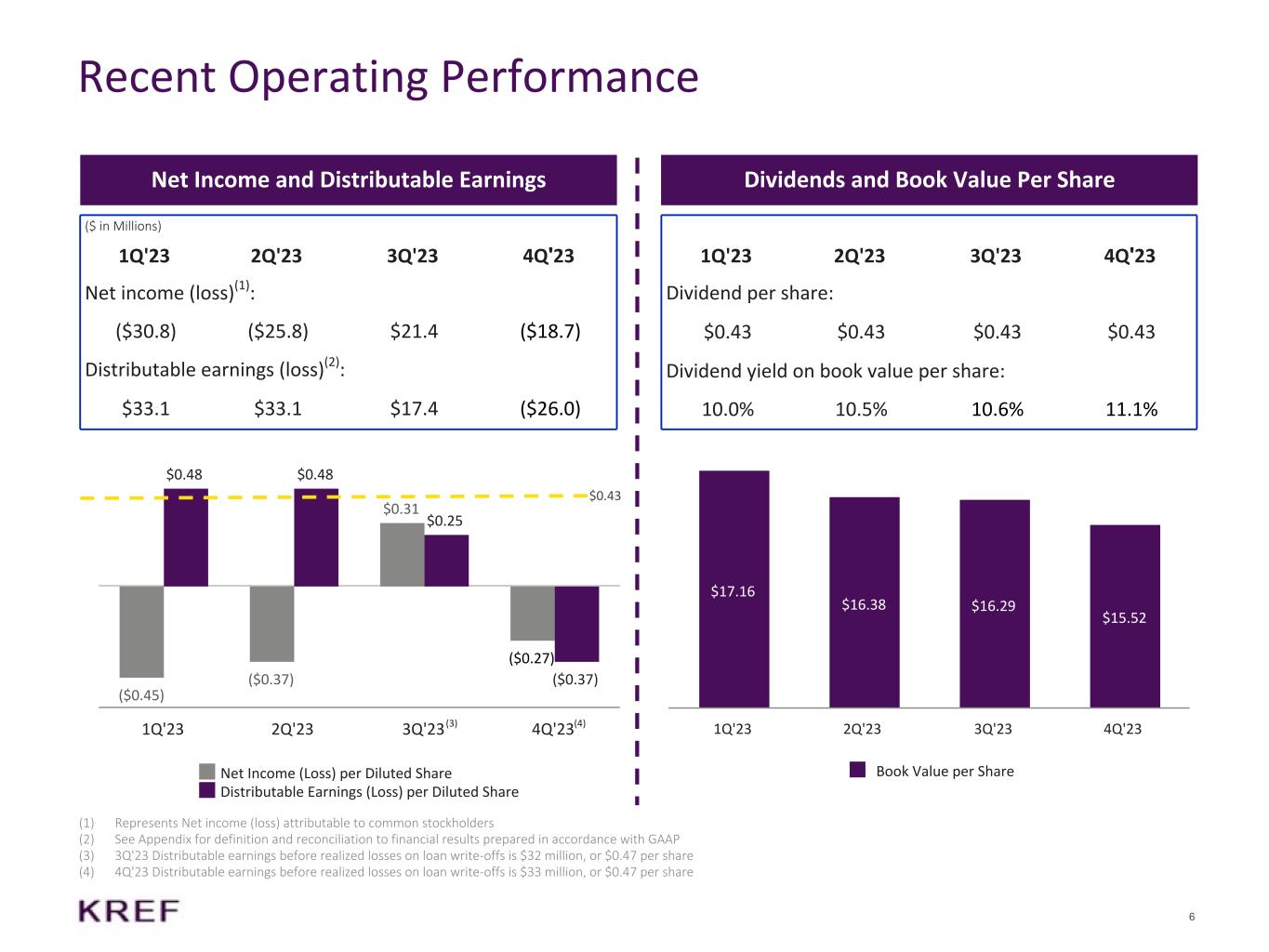 5 4Q'23 Financial Summary (1) See Appendix for definition and reconciliation to financial results prepared in accordance with GAAP (2) Book value per share includes CECL allowance of $213 million or ($3.06) per share Income Statement ($ in Millions) 4Q'23 Net Interest Income $46.5 Other Income 4.2 Operating Expenses (14.1) Provision for Credit Losses (49.5) Preferred Stock Dividends (5.3) Other (0.5) Net Income (Loss) Attributable to Common Stockholders ($18.7) Net Income (Loss) per Share, Diluted ($0.27) Distributable Earnings (Loss)(1) ($26.0) Distributable Earnings (Loss) per Share, Diluted(1) ($0.37) Dividend per Share $0.43 Diluted Weighted Average Shares Outstanding 69,384,309 Balance Sheet ($ in Millions) 4Q'23 Commercial real estate loans, net $7,133.1 Real estate owned 183.1 Cash 135.9 Other 95.5 Total Assets 7,547.6 Secured financing agreements, net 3,782.4 Collateralized loan obligations, net 1,942.2 Secured term loan, net 335.3 Other 83.5 Total Liabilities 6,143.4 Total Equity 1,404.2 Common Shareholders' Equity 1,077.0 Book Value per Share(2) $15.52 Common Shares Outstanding 69,313,860