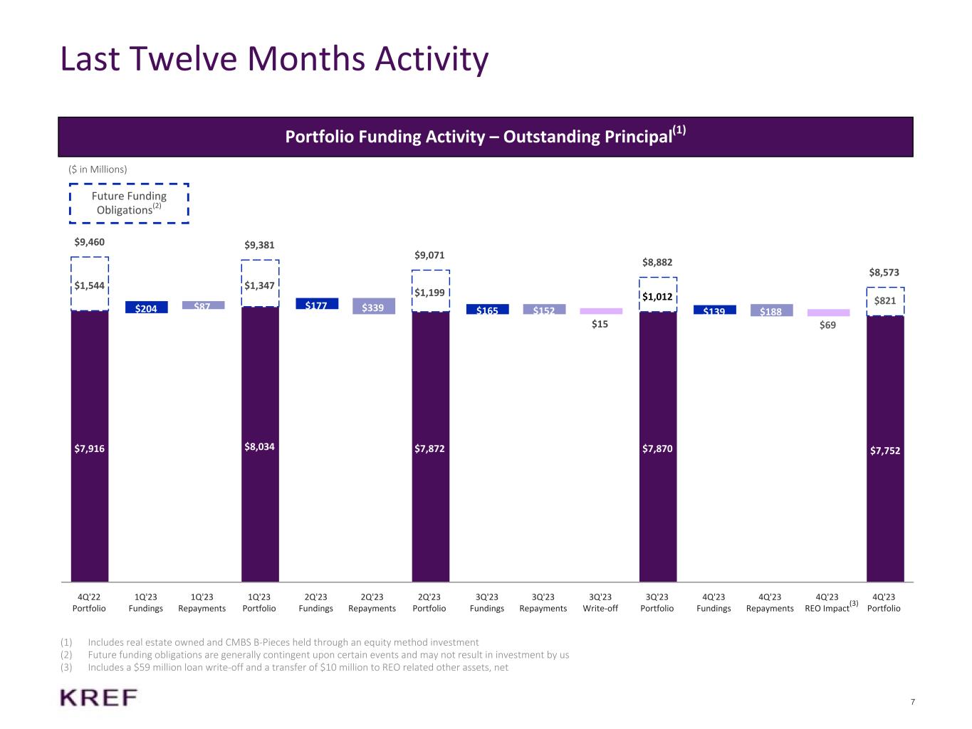 6 ($0.45) ($0.37) $0.31 ($0.27) $0.48 $0.48 $0.25 ($0.37) Net Income (Loss) per Diluted Share Distributable Earnings (Loss) per Diluted Share 1Q'23 2Q'23 3Q'23 4Q'23 $0.43 Recent Operating Performance (1) Represents Net income (loss) attributable to common stockholders (2) See Appendix for definition and reconciliation to financial results prepared in accordance with GAAP (3) 3Q'23 Distributable earnings before realized losses on loan write-offs is $32 million, or $0.47 per share (4) 4Q'23 Distributable earnings before realized losses on loan write-offs is $33 million, or $0.47 per share Net Income and Distributable Earnings Dividends and Book Value Per Share ($ in Millions) 1Q'23 2Q'23 3Q'23 4Q'23 Net income (loss)(1): ($30.8) ($25.8) $21.4 ($18.7) Distributable earnings (loss)(2): $33.1 $33.1 $17.4 ($26.0) 1Q'23 2Q'23 3Q'23 4Q'23 Dividend per share: $0.43 $0.43 $0.43 $0.43 Dividend yield on book value per share: 10.0% 10.5% 10.6% 11.1% $17.16 $16.38 $16.29 $15.52 Book Value per Share 1Q'23 2Q'23 3Q'23 4Q'23(3) (4)