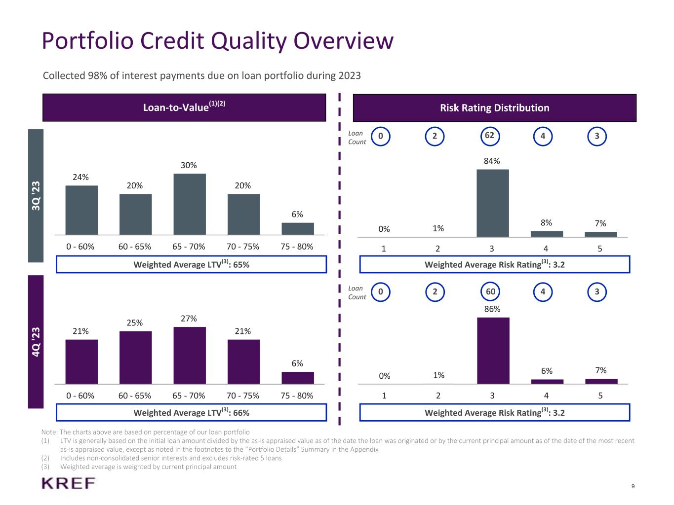 8 Class-A 74% Class-B 26% KREF Loan Portfolio by the Numbers (1) Includes real estate owned and CMBS B-Pieces held through an equity method investment (2) Senior loans include senior mortgages and similar credit quality loans, including related contiguous junior participations in senior loans where KREF has financed a loan with structural leverage through the non-recourse sale of a corresponding first mortgage (3) KREF classifies a loan as life science if more than 50% of the gross leasable area is leased to, or will be converted to, life science-related space (4) “Other” property types include: 2% Condo (Residential), 2% Self-Storage, 1% Student Housing and 1% Single Family Rental (5) Office property certification % is based on current principal loan balance; see description for LEED certification in the Appendix Geography Investment Type(2) Property Type Interest Rate TypeTotal Portfolio(1) 6% 8% 9% 15% 18% 12% Other <5%: 26% ($ in Millions) 92% Office(5)6% Washington, D.C. $5,075 $4,998 $6,792 $7,916 $7,752 4Q'19 4Q'20 4Q'21 4Q'22 4Q'23 Senior Loans 100% Floating 99% Fixed 1% Multifamily Class-A 93% Class-B 7% Multifamily 41% Office 24% Industrial 14% Life Science 10% Hospitality 5% Other 6% (3) (4)