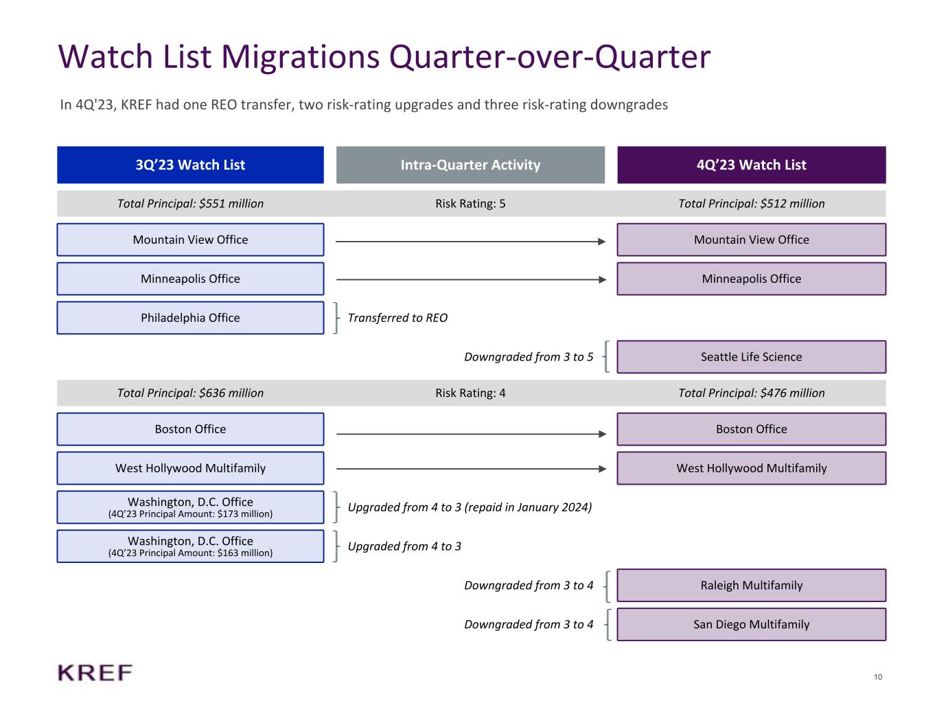 9 0% 1% 84% 8% 7% 1 2 3 4 5 Weighted Average Risk Rating(3): 3.2 Portfolio Credit Quality Overview Note: The charts above are based on percentage of our loan portfolio (1) LTV is generally based on the initial loan amount divided by the as-is appraised value as of the date the loan was originated or by the current principal amount as of the date of the most recent as-is appraised value, except as noted in the footnotes to the “Portfolio Details” Summary in the Appendix (2) Includes non-consolidated senior interests and excludes risk-rated 5 loans (3) Weighted average is weighted by current principal amount Collected 98% of interest payments due on loan portfolio during 2023 Loan-to-Value(1)(2) Risk Rating Distribution Weighted Average LTV(3): 65% Loan Count 4Q '2 3 Weighted Average LTV(3): 66% Weighted Average Risk Rating(3): 3.2 3Q '2 3 24% 20% 30% 20% 6% 0 - 60% 60 - 65% 65 - 70% 70 - 75% 75 - 80% 21% 25% 27% 21% 6% 0 - 60% 60 - 65% 65 - 70% 70 - 75% 75 - 80% 0 2 4 362 0 2 4 360Loan Count 0% 1% 86% 6% 7% 1 2 3 4 5