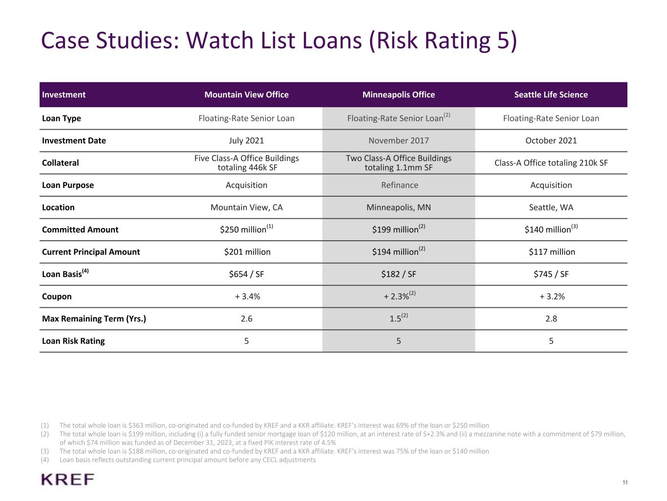 10 Watch List Migrations Quarter-over-Quarter In 4Q'23, KREF had one REO transfer, two risk-rating upgrades and three risk-rating downgrades 3Q’23 Watch List Intra-Quarter Activity 4Q’23 Watch List Total Principal: $551 million Risk Rating: 5 Total Principal: $512 million Mountain View Office Mountain View Office Minneapolis Office Minneapolis Office Philadelphia Office Transferred to REO Downgraded from 3 to 5 Seattle Life Science Total Principal: $636 million Risk Rating: 4 Total Principal: $476 million Boston Office Boston Office West Hollywood Multifamily West Hollywood Multifamily Washington, D.C. Office (4Q’23 Principal Amount: $173 million) Upgraded from 4 to 3 (repaid in January 2024) Washington, D.C. Office (4Q’23 Principal Amount: $163 million) Upgraded from 4 to 3 Downgraded from 3 to 4 Raleigh Multifamily Downgraded from 3 to 4 San Diego Multifamily