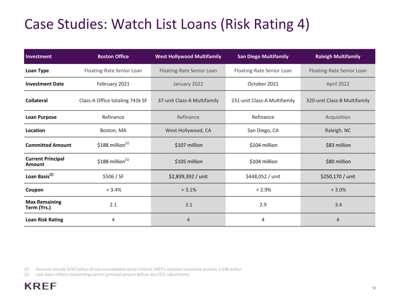 11 Case Studies: Watch List Loans (Risk Rating 5) Investment Mountain View Office Minneapolis Office Seattle Life Science Loan Type Floating-Rate Senior Loan Floating-Rate Senior Loan(2) Floating-Rate Senior Loan Investment Date July 2021 November 2017 October 2021 Collateral Five Class-A Office Buildings totaling 446k SF Two Class-A Office Buildings totaling 1.1mm SF Class-A Office totaling 210k SF Loan Purpose Acquisition Refinance Acquisition Location Mountain View, CA Minneapolis, MN Seattle, WA Committed Amount $250 million(1) $199 million(2) $140 million(3) Current Principal Amount $201 million $194 million(2) $117 million Loan Basis(4) $654 / SF $182 / SF $745 / SF Coupon + 3.4% + 2.3%(2) + 3.2% Max Remaining Term (Yrs.) 2.6 1.5(2) 2.8 Loan Risk Rating 5 5 5 (1) The total whole loan is $363 million, co-originated and co-funded by KREF and a KKR affiliate. KREF’s interest was 69% of the loan or $250 million (2) The total whole loan is $199 million, including (i) a fully funded senior mortgage loan of $120 million, at an interest rate of S+2.3% and (ii) a mezzanine note with a commitment of $79 million, of which $74 million was funded as of December 31, 2023, at a fixed PIK interest rate of 4.5% (3) The total whole loan is $188 million, co-originated and co-funded by KREF and a KKR affiliate. KREF’s interest was 75% of the loan or $140 million (4) Loan basis reflects outstanding current principal amount before any CECL adjustments