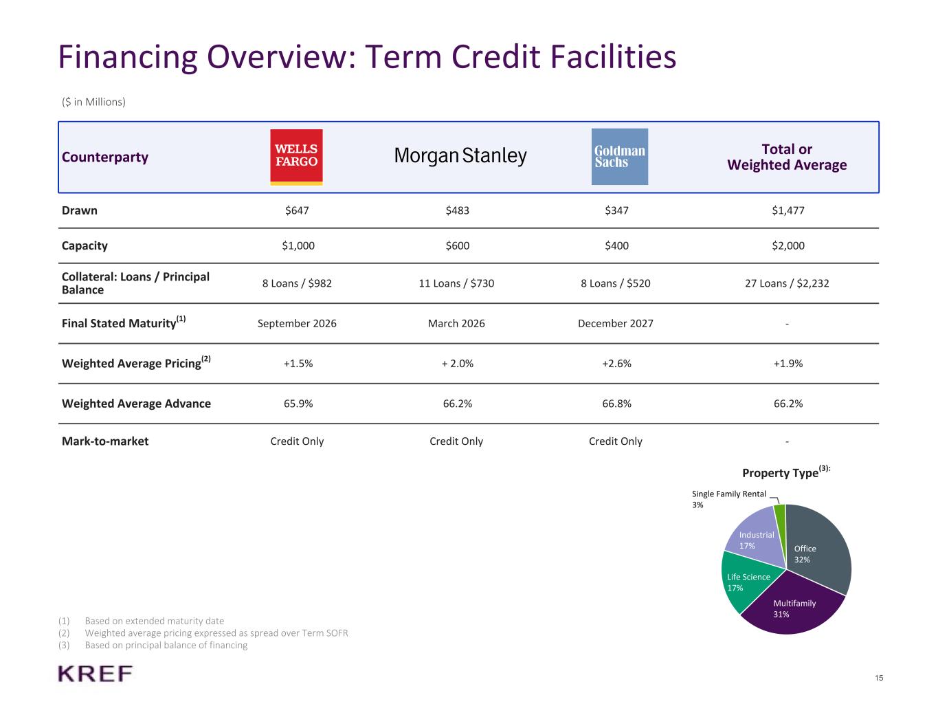 14 Financing Overview: 76% Non-Mark-To-Market Diversified financing sources totaling $8.9 billion with $2.8 billion of undrawn capacity Summary of Outstanding Financing Leverage Ratios (3) Outstanding Financing(5) ($ in Millions) Maximum Capacity Outstanding Principal Amount Weighted Avg. Coupon(1) Advance Rate Non- MTM Term Credit Facilities $2,000 $1,477 +1.9% 66.2% (2) Term Lending Agreements $1,977 $1,329 +1.8% 76.5% ü Warehouse Facility $500 $0 n/a n/a ü Secured Term Loan $343 $343 +3.6% — ü Corporate Revolving Credit Facility $610 $160 +2.0% — ü Total Debt $5,430 $3,310 Collateralized Loan Obligations $1,943 $1,943 +1.5% 84.5% ü Term Loan Facility $1,000 $561 +1.9% 78.1% ü Asset Specific Financing $491 $266 +2.9% 83.0% ü Total Leverage $8,864 $6,080 2.3 4.2 Debt-To-Equity Ratio Total Leverage Ratio(4) x x (1) Weighted average coupon expressed as spread over Term SOFR (2) Term credit facilities are marked to credit only and not subject to capital markets mark-to-market provisions (3) Represents (i) total outstanding debt agreements (excluding non-recourse facilities), and secured term loan, less cash to (ii) total permanent equity, in each case, at period end (4) Represents (i) total outstanding debt agreements, secured term loan, and collateralized loan obligation, less cash to (ii) total permanent equity, in each case, at period end (5) Based on outstanding principal amount of secured financing, including non-consolidated senior interests, that resulted from non-recourse sales of senior loan interest in loans KREF originated Collateralized Loan Obligations 31% Term Lending Agreements 21% Term Loan Facility 9% Secured Term Loan 5% Asset Specific 4% Senior Loan Interests 3% Revolver 3% Term Credit Facilities 24% Non-Mark- to-Market 76%