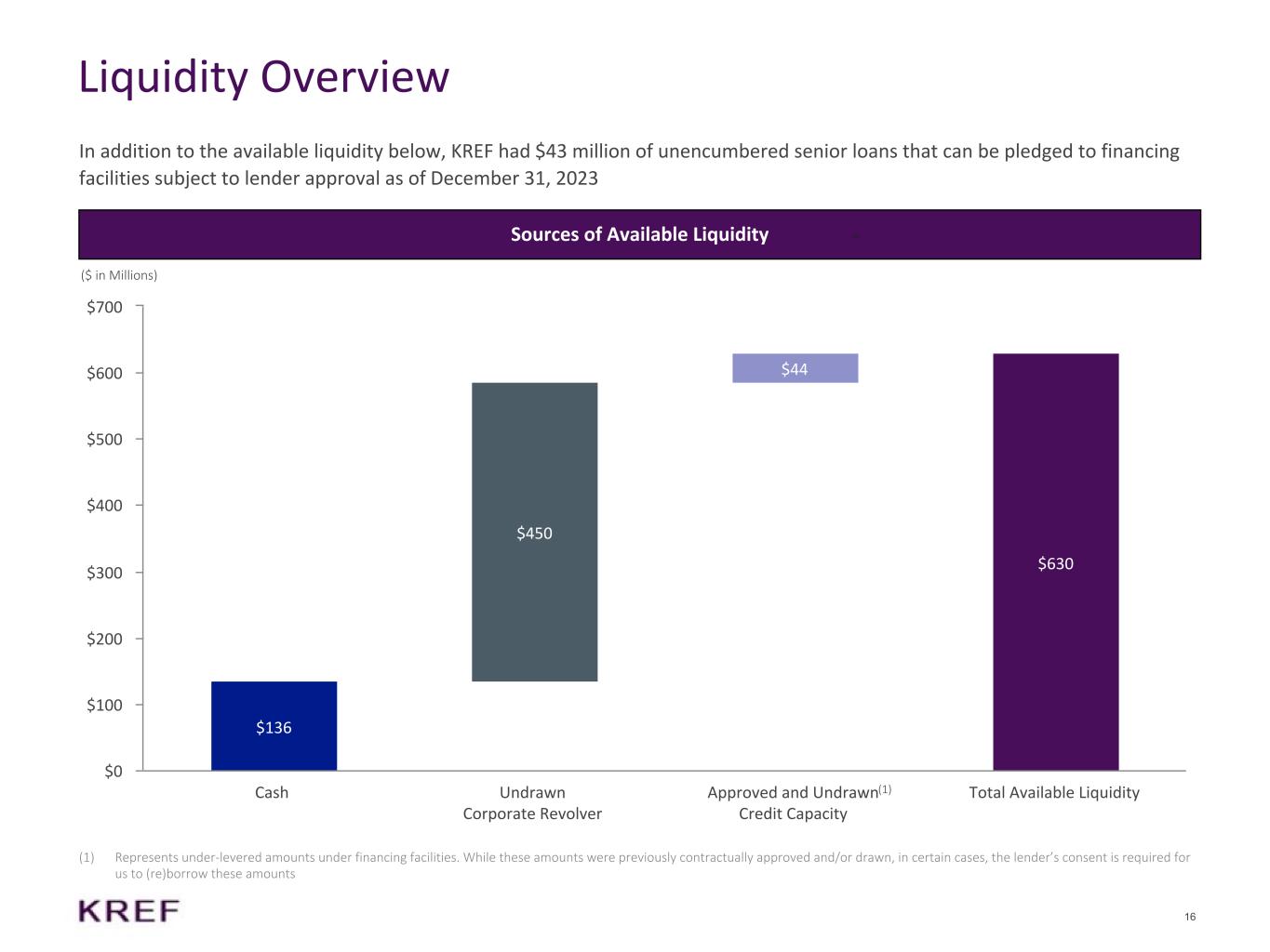 15 Financing Overview: Term Credit Facilities Counterparty Total or Weighted Average Drawn $647 $483 $347 $1,477 Capacity $1,000 $600 $400 $2,000 Collateral: Loans / Principal Balance 8 Loans / $982 11 Loans / $730 8 Loans / $520 27 Loans / $2,232 Final Stated Maturity(1) September 2026 March 2026 December 2027 - Weighted Average Pricing(2) +1.5% + 2.0% +2.6% +1.9% Weighted Average Advance 65.9% 66.2% 66.8% 66.2% Mark-to-market Credit Only Credit Only Credit Only - ($ in Millions) (1) Based on extended maturity date (2) Weighted average pricing expressed as spread over Term SOFR (3) Based on principal balance of financing Property Type(3): Office 32% Multifamily 31% Life Science 17% Industrial 17% Single Family Rental 3%
