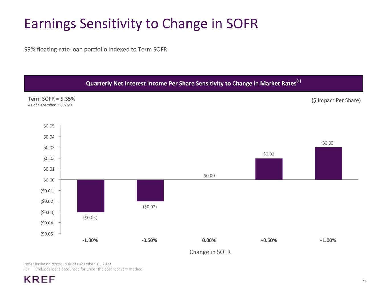 16 $136 $586 $136 $450 $44 $630 Cash Undrawn Corporate Revolver Approved and Undrawn Credit Capacity Total Available Liquidity $0 $100 $200 $300 $400 $500 $600 $700 Liquidity Overview (1) Represents under-levered amounts under financing facilities. While these amounts were previously contractually approved and/or drawn, in certain cases, the lender’s consent is required for us to (re)borrow these amounts ($ in Millions) Sources of Available Liquidity In addition to the available liquidity below, KREF had $43 million of unencumbered senior loans that can be pledged to financing facilities subject to lender approval as of December 31, 2023 (4) (1)
