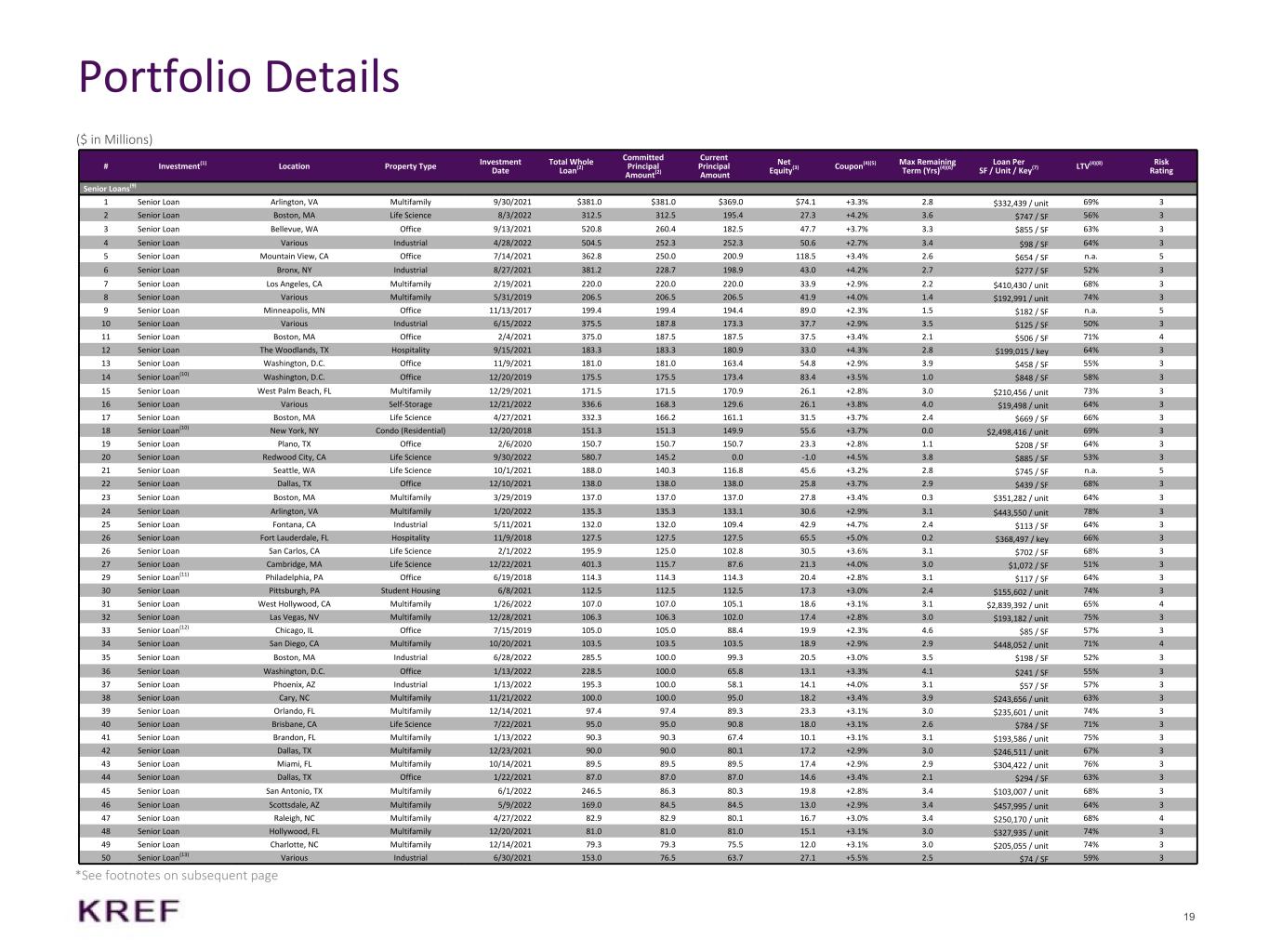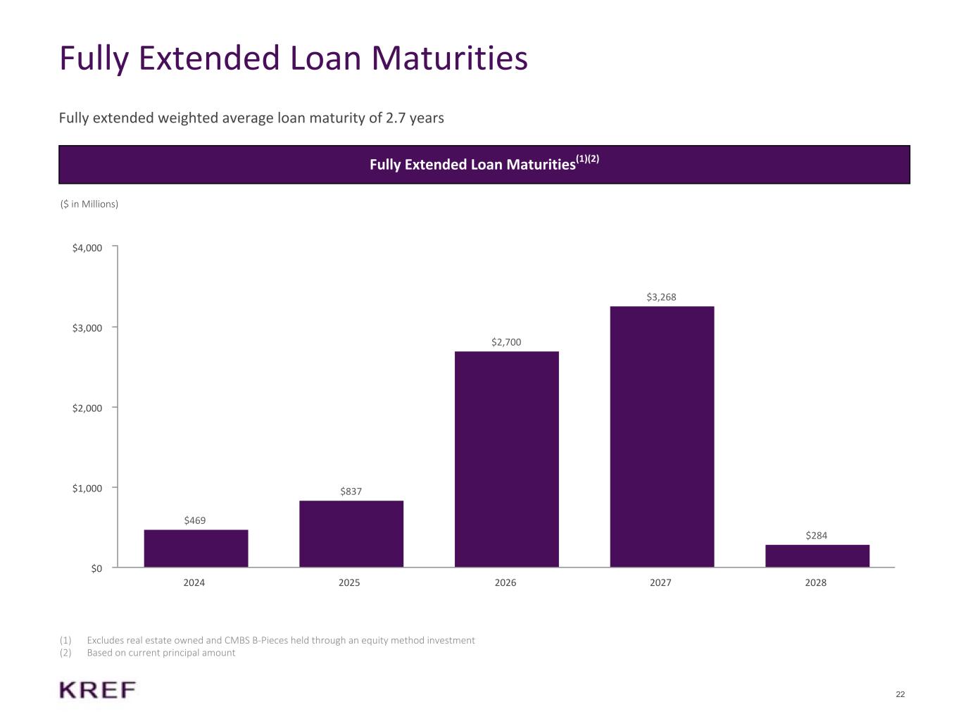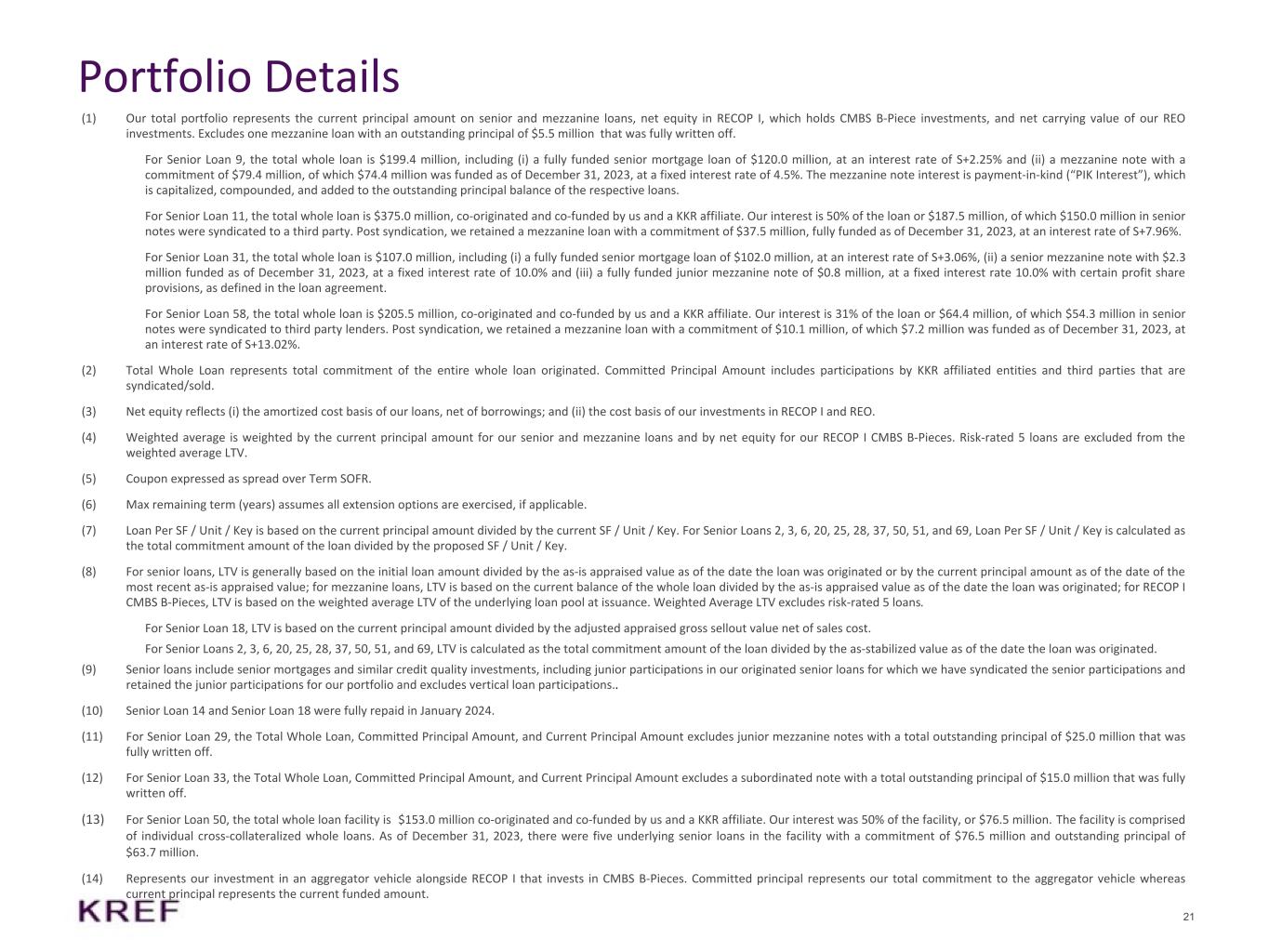 21 Portfolio Details (1) Our total portfolio represents the current principal amount on senior and mezzanine loans, net equity in RECOP I, which holds CMBS B-Piece investments, and net carrying value of our REO investments. Excludes one mezzanine loan with an outstanding principal of $5.5 million that was fully written off. For Senior Loan 9, the total whole loan is $199.4 million, including (i) a fully funded senior mortgage loan of $120.0 million, at an interest rate of S+2.25% and (ii) a mezzanine note with a commitment of $79.4 million, of which $74.4 million was funded as of December 31, 2023, at a fixed interest rate of 4.5%. The mezzanine note interest is payment-in-kind (“PIK Interest”), which is capitalized, compounded, and added to the outstanding principal balance of the respective loans. For Senior Loan 11, the total whole loan is $375.0 million, co-originated and co-funded by us and a KKR affiliate. Our interest is 50% of the loan or $187.5 million, of which $150.0 million in senior notes were syndicated to a third party. Post syndication, we retained a mezzanine loan with a commitment of $37.5 million, fully funded as of December 31, 2023, at an interest rate of S+7.96%. For Senior Loan 31, the total whole loan is $107.0 million, including (i) a fully funded senior mortgage loan of $102.0 million, at an interest rate of S+3.06%, (ii) a senior mezzanine note with $2.3 million funded as of December 31, 2023, at a fixed interest rate of 10.0% and (iii) a fully funded junior mezzanine note of $0.8 million, at a fixed interest rate 10.0% with certain profit share provisions, as defined in the loan agreement. For Senior Loan 58, the total whole loan is $205.5 million, co-originated and co-funded by us and a KKR affiliate. Our interest is 31% of the loan or $64.4 million, of which $54.3 million in senior notes were syndicated to third party lenders. Post syndication, we retained a mezzanine loan with a commitment of $10.1 million, of which $7.2 million was funded as of December 31, 2023, at an interest rate of S+13.02%. (2) Total Whole Loan represents total commitment of the entire whole loan originated. Committed Principal Amount includes participations by KKR affiliated entities and third parties that are syndicated/sold. (3) Net equity reflects (i) the amortized cost basis of our loans, net of borrowings; and (ii) the cost basis of our investments in RECOP I and REO. (4) Weighted average is weighted by the current principal amount for our senior and mezzanine loans and by net equity for our RECOP I CMBS B-Pieces. Risk-rated 5 loans are excluded from the weighted average LTV. (5) Coupon expressed as spread over Term SOFR. (6) Max remaining term (years) assumes all extension options are exercised, if applicable. (7) Loan Per SF / Unit / Key is based on the current principal amount divided by the current SF / Unit / Key. For Senior Loans 2, 3, 6, 20, 25, 28, 37, 50, 51, and 69, Loan Per SF / Unit / Key is calculated as the total commitment amount of the loan divided by the proposed SF / Unit / Key. (8) For senior loans, LTV is generally based on the initial loan amount divided by the as-is appraised value as of the date the loan was originated or by the current principal amount as of the date of the most recent as-is appraised value; for mezzanine loans, LTV is based on the current balance of the whole loan divided by the as-is appraised value as of the date the loan was originated; for RECOP I CMBS B-Pieces, LTV is based on the weighted average LTV of the underlying loan pool at issuance. Weighted Average LTV excludes risk-rated 5 loans. For Senior Loan 18, LTV is based on the current principal amount divided by the adjusted appraised gross sellout value net of sales cost. For Senior Loans 2, 3, 6, 20, 25, 28, 37, 50, 51, and 69, LTV is calculated as the total commitment amount of the loan divided by the as-stabilized value as of the date the loan was originated. (9) Senior loans include senior mortgages and similar credit quality investments, including junior participations in our originated senior loans for which we have syndicated the senior participations and retained the junior participations for our portfolio and excludes vertical loan participations.. (10) Senior Loan 14 and Senior Loan 18 were fully repaid in January 2024. (11) For Senior Loan 29, the Total Whole Loan, Committed Principal Amount, and Current Principal Amount excludes junior mezzanine notes with a total outstanding principal of $25.0 million that was fully written off. (12) For Senior Loan 33, the Total Whole Loan, Committed Principal Amount, and Current Principal Amount excludes a subordinated note with a total outstanding principal of $15.0 million that was fully written off. (13) For Senior Loan 50, the total whole loan facility is $153.0 million co-originated and co-funded by us and a KKR affiliate. Our interest was 50% of the facility, or $76.5 million. The facility is comprised of individual cross-collateralized whole loans. As of December 31, 2023, there were five underlying senior loans in the facility with a commitment of $76.5 million and outstanding principal of $63.7 million. (14) Represents our investment in an aggregator vehicle alongside RECOP I that invests in CMBS B-Pieces. Committed principal represents our total commitment to the aggregator vehicle whereas current principal represents the current funded amount.