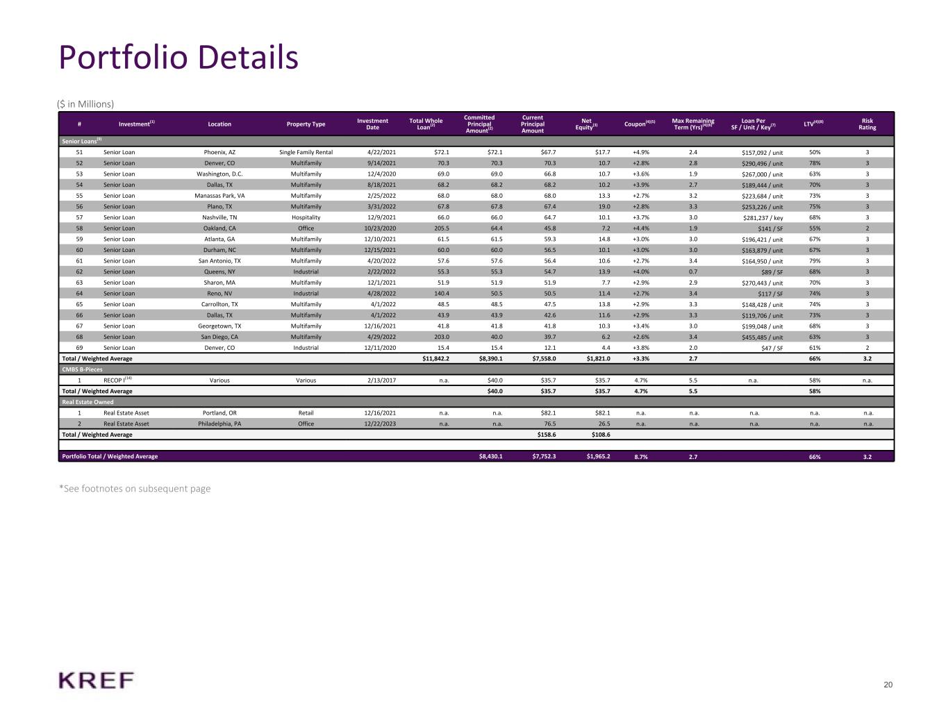 19 Portfolio Details ($ in Millions) # Investment(1) Location Property Type Investment Date Total Whole Loan(2) Committed Principal Amount(2) Current Principal Amount Net Equity(3) Coupon(4)(5) Max Remaining Term (Yrs)(4)(6) Loan Per SF / Unit / Key(7) LTV(4)(8) Risk Rating Senior Loans(9) 1 Senior Loan Arlington, VA Multifamily 9/30/2021 $381.0 $381.0 $369.0 $74.1 +3.3% 2.8 $332,439 / unit 69% 3 2 Senior Loan Boston, MA Life Science 8/3/2022 312.5 312.5 195.4 27.3 +4.2% 3.6 $747 / SF 56% 3 3 Senior Loan Bellevue, WA Office 9/13/2021 520.8 260.4 182.5 47.7 +3.7% 3.3 $855 / SF 63% 3 4 Senior Loan Various Industrial 4/28/2022 504.5 252.3 252.3 50.6 +2.7% 3.4 $98 / SF 64% 3 5 Senior Loan Mountain View, CA Office 7/14/2021 362.8 250.0 200.9 118.5 +3.4% 2.6 $654 / SF n.a. 5 6 Senior Loan Bronx, NY Industrial 8/27/2021 381.2 228.7 198.9 43.0 +4.2% 2.7 $277 / SF 52% 3 7 Senior Loan Los Angeles, CA Multifamily 2/19/2021 220.0 220.0 220.0 33.9 +2.9% 2.2 $410,430 / unit 68% 3 8 Senior Loan Various Multifamily 5/31/2019 206.5 206.5 206.5 41.9 +4.0% 1.4 $192,991 / unit 74% 3 9 Senior Loan Minneapolis, MN Office 11/13/2017 199.4 199.4 194.4 89.0 +2.3% 1.5 $182 / SF n.a. 5 10 Senior Loan Various Industrial 6/15/2022 375.5 187.8 173.3 37.7 +2.9% 3.5 $125 / SF 50% 3 11 Senior Loan Boston, MA Office 2/4/2021 375.0 187.5 187.5 37.5 +3.4% 2.1 $506 / SF 71% 4 12 Senior Loan The Woodlands, TX Hospitality 9/15/2021 183.3 183.3 180.9 33.0 +4.3% 2.8 $199,015 / key 64% 3 13 Senior Loan Washington, D.C. Office 11/9/2021 181.0 181.0 163.4 54.8 +2.9% 3.9 $458 / SF 55% 3 14 Senior Loan(10) Washington, D.C. Office 12/20/2019 175.5 175.5 173.4 83.4 +3.5% 1.0 $848 / SF 58% 3 15 Senior Loan West Palm Beach, FL Multifamily 12/29/2021 171.5 171.5 170.9 26.1 +2.8% 3.0 $210,456 / unit 73% 3 16 Senior Loan Various Self-Storage 12/21/2022 336.6 168.3 129.6 26.1 +3.8% 4.0 $19,498 / unit 64% 3 17 Senior Loan Boston, MA Life Science 4/27/2021 332.3 166.2 161.1 31.5 +3.7% 2.4 $669 / SF 66% 3 18 Senior Loan(10) New York, NY Condo (Residential) 12/20/2018 151.3 151.3 149.9 55.6 +3.7% 0.0 $2,498,416 / unit 69% 3 19 Senior Loan Plano, TX Office 2/6/2020 150.7 150.7 150.7 23.3 +2.8% 1.1 $208 / SF 64% 3 20 Senior Loan Redwood City, CA Life Science 9/30/2022 580.7 145.2 0.0 -1.0 +4.5% 3.8 $885 / SF 53% 3 21 Senior Loan Seattle, WA Life Science 10/1/2021 188.0 140.3 116.8 45.6 +3.2% 2.8 $745 / SF n.a. 5 22 Senior Loan Dallas, TX Office 12/10/2021 138.0 138.0 138.0 25.8 +3.7% 2.9 $439 / SF 68% 3 23 Senior Loan Boston, MA Multifamily 3/29/2019 137.0 137.0 137.0 27.8 +3.4% 0.3 $351,282 / unit 64% 3 24 Senior Loan Arlington, VA Multifamily 1/20/2022 135.3 135.3 133.1 30.6 +2.9% 3.1 $443,550 / unit 78% 3 25 Senior Loan Fontana, CA Industrial 5/11/2021 132.0 132.0 109.4 42.9 +4.7% 2.4 $113 / SF 64% 3 26 Senior Loan Fort Lauderdale, FL Hospitality 11/9/2018 127.5 127.5 127.5 65.5 +5.0% 0.2 $368,497 / key 66% 3 26 Senior Loan San Carlos, CA Life Science 2/1/2022 195.9 125.0 102.8 30.5 +3.6% 3.1 $702 / SF 68% 3 27 Senior Loan Cambridge, MA Life Science 12/22/2021 401.3 115.7 87.6 21.3 +4.0% 3.0 $1,072 / SF 51% 3 29 Senior Loan(11) Philadelphia, PA Office 6/19/2018 114.3 114.3 114.3 20.4 +2.8% 3.1 $117 / SF 64% 3 30 Senior Loan Pittsburgh, PA Student Housing 6/8/2021 112.5 112.5 112.5 17.3 +3.0% 2.4 $155,602 / unit 74% 3 31 Senior Loan West Hollywood, CA Multifamily 1/26/2022 107.0 107.0 105.1 18.6 +3.1% 3.1 $2,839,392 / unit 65% 4 32 Senior Loan Las Vegas, NV Multifamily 12/28/2021 106.3 106.3 102.0 17.4 +2.8% 3.0 $193,182 / unit 75% 3 33 Senior Loan(12) Chicago, IL Office 7/15/2019 105.0 105.0 88.4 19.9 +2.3% 4.6 $85 / SF 57% 3 34 Senior Loan San Diego, CA Multifamily 10/20/2021 103.5 103.5 103.5 18.9 +2.9% 2.9 $448,052 / unit 71% 4 35 Senior Loan Boston, MA Industrial 6/28/2022 285.5 100.0 99.3 20.5 +3.0% 3.5 $198 / SF 52% 3 36 Senior Loan Washington, D.C. Office 1/13/2022 228.5 100.0 65.8 13.1 +3.3% 4.1 $241 / SF 55% 3 37 Senior Loan Phoenix, AZ Industrial 1/13/2022 195.3 100.0 58.1 14.1 +4.0% 3.1 $57 / SF 57% 3 38 Senior Loan Cary, NC Multifamily 11/21/2022 100.0 100.0 95.0 18.2 +3.4% 3.9 $243,656 / unit 63% 3 39 Senior Loan Orlando, FL Multifamily 12/14/2021 97.4 97.4 89.3 23.3 +3.1% 3.0 $235,601 / unit 74% 3 40 Senior Loan Brisbane, CA Life Science 7/22/2021 95.0 95.0 90.8 18.0 +3.1% 2.6 $784 / SF 71% 3 41 Senior Loan Brandon, FL Multifamily 1/13/2022 90.3 90.3 67.4 10.1 +3.1% 3.1 $193,586 / unit 75% 3 42 Senior Loan Dallas, TX Multifamily 12/23/2021 90.0 90.0 80.1 17.2 +2.9% 3.0 $246,511 / unit 67% 3 43 Senior Loan Miami, FL Multifamily 10/14/2021 89.5 89.5 89.5 17.4 +2.9% 2.9 $304,422 / unit 76% 3 44 Senior Loan Dallas, TX Office 1/22/2021 87.0 87.0 87.0 14.6 +3.4% 2.1 $294 / SF 63% 3 45 Senior Loan San Antonio, TX Multifamily 6/1/2022 246.5 86.3 80.3 19.8 +2.8% 3.4 $103,007 / unit 68% 3 46 Senior Loan Scottsdale, AZ Multifamily 5/9/2022 169.0 84.5 84.5 13.0 +2.9% 3.4 $457,995 / unit 64% 3 47 Senior Loan Raleigh, NC Multifamily 4/27/2022 82.9 82.9 80.1 16.7 +3.0% 3.4 $250,170 / unit 68% 4 48 Senior Loan Hollywood, FL Multifamily 12/20/2021 81.0 81.0 81.0 15.1 +3.1% 3.0 $327,935 / unit 74% 3 49 Senior Loan Charlotte, NC Multifamily 12/14/2021 79.3 79.3 75.5 12.0 +3.1% 3.0 $205,055 / unit 74% 3 50 Senior Loan(13) Various Industrial 6/30/2021 153.0 76.5 63.7 27.1 +5.5% 2.5 $74 / SF 59% 3 *See footnotes on subsequent page