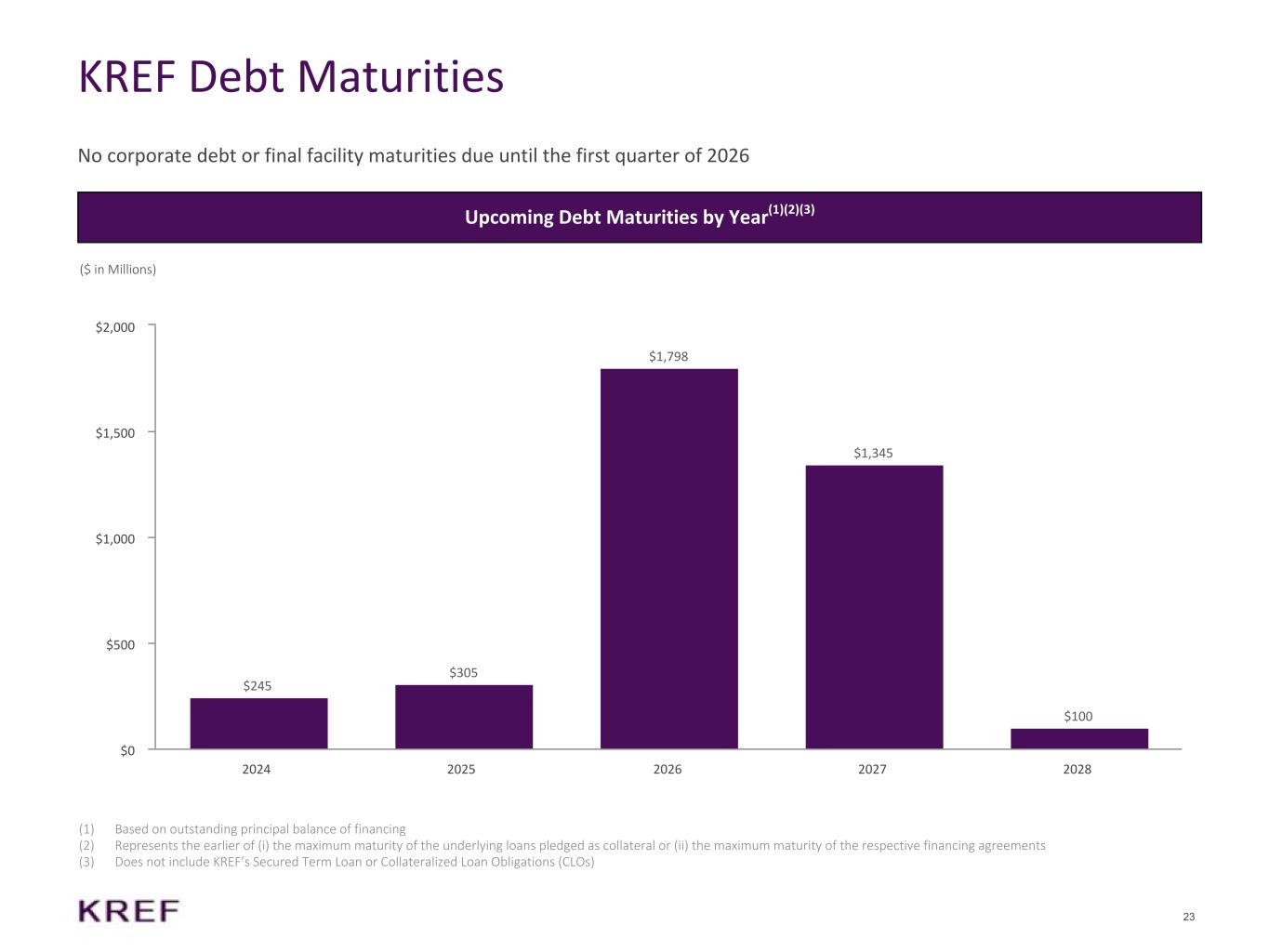 23 KREF Debt Maturities (1) Based on outstanding principal balance of financing (2) Represents the earlier of (i) the maximum maturity of the underlying loans pledged as collateral or (ii) the maximum maturity of the respective financing agreements (3) Does not include KREF’s Secured Term Loan or Collateralized Loan Obligations (CLOs) Upcoming Debt Maturities by Year(1)(2)(3) ($ in Millions) $245 $305 $1,798 $1,345 $100 2024 2025 2026 2027 2028 $0 $500 $1,000 $1,500 $2,000 No corporate debt or final facility maturities due until the first quarter of 2026