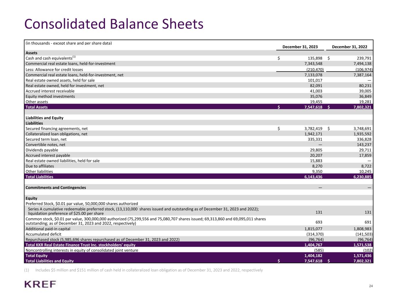 24 Consolidated Balance Sheets (1) Includes $5 million and $151 million of cash held in collateralized loan obligation as of December 31, 2023 and 2022, respectively (in thousands - except share and per share data) December 31, 2023 December 31, 2022 Assets Cash and cash equivalents(1) $ 135,898 $ 239,791 Commercial real estate loans, held-for-investment 7,343,548 7,494,138 Less: Allowance for credit losses (210,470) (106,974) Commercial real estate loans, held-for-investment, net 7,133,078 7,387,164 Real estate owned assets, held for sale 101,017 — Real estate owned, held for investment, net 82,091 80,231 Accrued interest receivable 41,003 39,005 Equity method investments 35,076 36,849 Other assets 19,455 19,281 Total Assets $ 7,547,618 $ 7,802,321 Liabilities and Equity Liabilities Secured financing agreements, net $ 3,782,419 $ 3,748,691 Collateralized loan obligations, net 1,942,171 1,935,592 Secured term loan, net 335,331 336,828 Convertible notes, net — 143,237 Dividends payable 29,805 29,711 Accrued interest payable 20,207 17,859 Real estate owned liabilities, held for sale 15,883 — Due to affiliates 8,270 8,722 Other liabilities 9,350 10,245 Total Liabilities 6,143,436 6,230,885 Commitments and Contingencies — — Equity Preferred Stock, $0.01 par value, 50,000,000 shares authorized Series A cumulative redeemable preferred stock, (13,110,000 shares issued and outstanding as of December 31, 2023 and 2022); liquidation preference of $25.00 per share 131 131 Common stock, $0.01 par value, 300,000,000 authorized (75,299,556 and 75,080,707 shares issued; 69,313,860 and 69,095,011 shares outstanding; as of December 31, 2023 and 2022, respectively) 693 691 Additional paid-in capital 1,815,077 1,808,983 Accumulated deficit (314,370) (141,503) Repurchased stock (5,985,696 shares repurchased as of December 31, 2023 and 2022) (96,764) (96,764) Total KKR Real Estate Finance Trust Inc. stockholders' equity 1,404,767 1,571,538 Noncontrolling interests in equity of consolidated joint venture (585) (102) Total Equity 1,404,182 1,571,436 Total Liabilities and Equity $ 7,547,618 $ 7,802,321