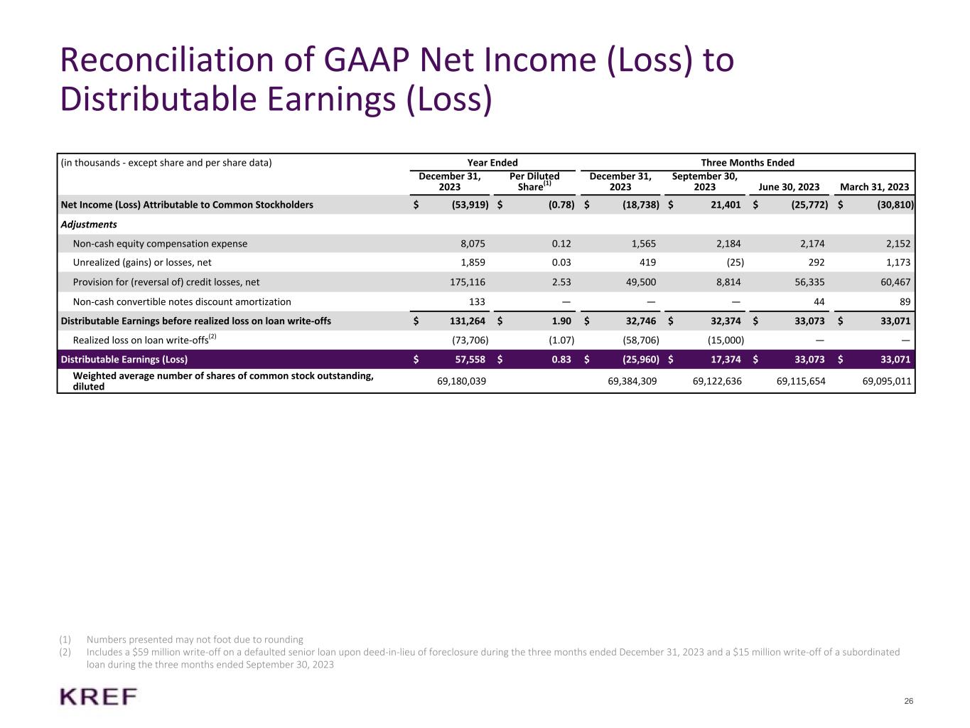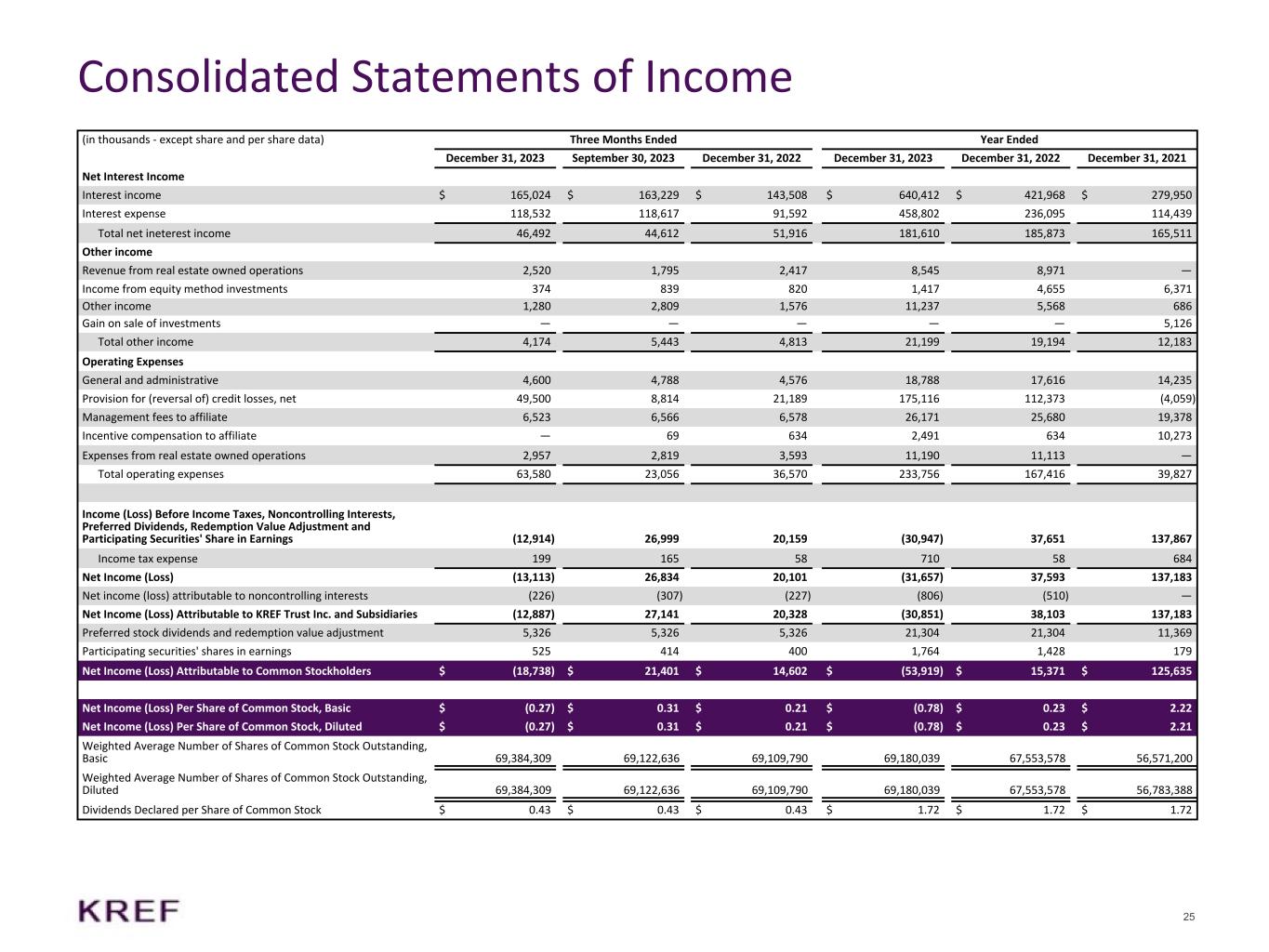 25 Consolidated Statements of Income (in thousands - except share and per share data) Three Months Ended Year Ended December 31, 2023 September 30, 2023 December 31, 2022 December 31, 2023 December 31, 2022 December 31, 2021 Net Interest Income Interest income $ 165,024 $ 163,229 $ 143,508 $ 640,412 $ 421,968 $ 279,950 Interest expense 118,532 118,617 91,592 458,802 236,095 114,439 Total net ineterest income 46,492 44,612 51,916 181,610 185,873 165,511 Other income Revenue from real estate owned operations 2,520 1,795 2,417 8,545 8,971 — Income from equity method investments 374 839 820 1,417 4,655 6,371 Other income 1,280 2,809 1,576 11,237 5,568 686 Gain on sale of investments — — — — — 5,126 Total other income 4,174 5,443 4,813 21,199 19,194 12,183 Operating Expenses General and administrative 4,600 4,788 4,576 18,788 17,616 14,235 Provision for (reversal of) credit losses, net 49,500 8,814 21,189 175,116 112,373 (4,059) Management fees to affiliate 6,523 6,566 6,578 26,171 25,680 19,378 Incentive compensation to affiliate — 69 634 2,491 634 10,273 Expenses from real estate owned operations 2,957 2,819 3,593 11,190 11,113 — Total operating expenses 63,580 23,056 36,570 233,756 167,416 39,827 Income (Loss) Before Income Taxes, Noncontrolling Interests, Preferred Dividends, Redemption Value Adjustment and Participating Securities' Share in Earnings (12,914) 26,999 20,159 (30,947) 37,651 137,867 Income tax expense 199 165 58 710 58 684 Net Income (Loss) (13,113) 26,834 20,101 (31,657) 37,593 137,183 Net income (loss) attributable to noncontrolling interests (226) (307) (227) (806) (510) — Net Income (Loss) Attributable to KREF Trust Inc. and Subsidiaries (12,887) 27,141 20,328 (30,851) 38,103 137,183 Preferred stock dividends and redemption value adjustment 5,326 5,326 5,326 21,304 21,304 11,369 Participating securities' shares in earnings 525 414 400 1,764 1,428 179 Net Income (Loss) Attributable to Common Stockholders $ (18,738) $ 21,401 $ 14,602 $ (53,919) $ 15,371 $ 125,635 Net Income (Loss) Per Share of Common Stock, Basic $ (0.27) $ 0.31 $ 0.21 $ (0.78) $ 0.23 $ 2.22 Net Income (Loss) Per Share of Common Stock, Diluted $ (0.27) $ 0.31 $ 0.21 $ (0.78) $ 0.23 $ 2.21 Weighted Average Number of Shares of Common Stock Outstanding, Basic 69,384,309 69,122,636 69,109,790 69,180,039 67,553,578 56,571,200 Weighted Average Number of Shares of Common Stock Outstanding, Diluted 69,384,309 69,122,636 69,109,790 69,180,039 67,553,578 56,783,388 Dividends Declared per Share of Common Stock $ 0.43 $ 0.43 $ 0.43 $ 1.72 $ 1.72 $ 1.72