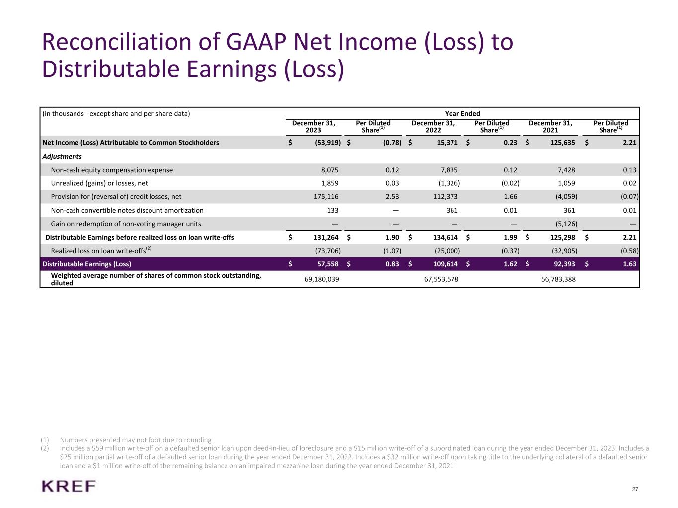 26 (1) Numbers presented may not foot due to rounding (2) Includes a $59 million write-off on a defaulted senior loan upon deed-in-lieu of foreclosure during the three months ended December 31, 2023 and a $15 million write-off of a subordinated loan during the three months ended September 30, 2023 (in thousands - except share and per share data) Year Ended Three Months Ended December 31, 2023 Per Diluted Share(1) December 31, 2023 September 30, 2023 June 30, 2023 March 31, 2023 Net Income (Loss) Attributable to Common Stockholders $ (53,919) $ (0.78) $ (18,738) $ 21,401 $ (25,772) $ (30,810) Adjustments Non-cash equity compensation expense 8,075 0.12 1,565 2,184 2,174 2,152 Unrealized (gains) or losses, net 1,859 0.03 419 (25) 292 1,173 Provision for (reversal of) credit losses, net 175,116 2.53 49,500 8,814 56,335 60,467 Non-cash convertible notes discount amortization 133 — — — 44 89 Distributable Earnings before realized loss on loan write-offs $ 131,264 $ 1.90 $ 32,746 $ 32,374 $ 33,073 $ 33,071 Realized loss on loan write-offs(2) (73,706) (1.07) (58,706) (15,000) — — Distributable Earnings (Loss) $ 57,558 $ 0.83 $ (25,960) $ 17,374 $ 33,073 $ 33,071 Weighted average number of shares of common stock outstanding, diluted 69,180,039 69,384,309 69,122,636 69,115,654 69,095,011 Reconciliation of GAAP Net Income (Loss) to Distributable Earnings (Loss)