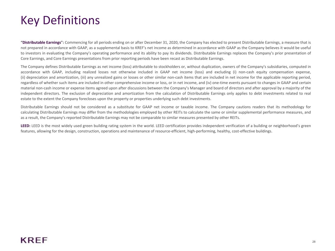 28 Key Definitions “Distributable Earnings": Commencing for all periods ending on or after December 31, 2020, the Company has elected to present Distributable Earnings, a measure that is not prepared in accordance with GAAP, as a supplemental basis to KREF’s net income as determined in accordance with GAAP as the Company believes it would be useful to investors in evaluating the Company’s operating performance and its ability to pay its dividends. Distributable Earnings replaces the Company’s prior presentation of Core Earnings, and Core Earnings presentations from prior reporting periods have been recast as Distributable Earnings. The Company defines Distributable Earnings as net income (loss) attributable to stockholders or, without duplication, owners of the Company's subsidiaries, computed in accordance with GAAP, including realized losses not otherwise included in GAAP net income (loss) and excluding (i) non-cash equity compensation expense, (ii) depreciation and amortization, (iii) any unrealized gains or losses or other similar non-cash items that are included in net income for the applicable reporting period, regardless of whether such items are included in other comprehensive income or loss, or in net income, and (iv) one-time events pursuant to changes in GAAP and certain material non-cash income or expense items agreed upon after discussions between the Company’s Manager and board of directors and after approval by a majority of the independent directors. The exclusion of depreciation and amortization from the calculation of Distributable Earnings only applies to debt investments related to real estate to the extent the Company forecloses upon the property or properties underlying such debt investments. Distributable Earnings should not be considered as a substitute for GAAP net income or taxable income. The Company cautions readers that its methodology for calculating Distributable Earnings may differ from the methodologies employed by other REITs to calculate the same or similar supplemental performance measures, and as a result, the Company’s reported Distributable Earnings may not be comparable to similar measures presented by other REITs. LEED: LEED is the most widely used green building rating system in the world. LEED certification provides independent verification of a building or neighborhood’s green features, allowing for the design, construction, operations and maintenance of resource-efficient, high-performing, healthy, cost-effective buildings.
