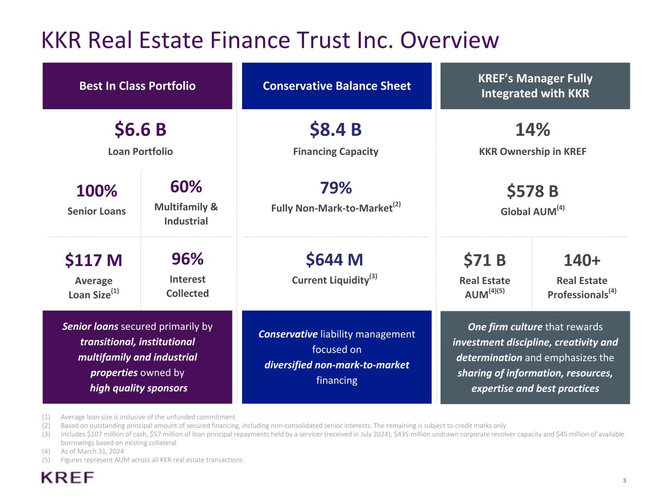 2 Legal Disclosures This presentation has been prepared for KKR Real Estate Finance Trust Inc. (NYSE: KREF) for the benefit of its stockholders. This presentation is solely for informational purposes in connection with evaluating the business, operations and financial results of KKR Real Estate Finance Trust Inc. and its subsidiaries (collectively, "KREF“ or the “Company”). This presentation is not and shall not be construed as an offer to purchase or sell, or the solicitation of an offer to purchase or sell, any securities, any investment advice or any other service by KREF. Nothing in this presentation constitutes the provision of any tax, accounting, financial, investment, regulatory, legal or other advice by KREF or its advisors. This presentation may not be referenced, quoted or linked by website by any third party, in whole or in part, except as agreed to in writing by KREF. This presentation contains forward-looking statements within the meaning of Section 27A of the Securities Act of 1933, as amended, and Section 21E of the Securities Exchange Act of 1934, as amended, which reflect the Company’s current views with respect to, among other things, its future operations and financial performance. You can identify these forward looking statements by the use of words such as “outlook,” “believe,” “expect,” “potential,” “continue,” “may,” “should,” “seek,” “approximately,” “predict,” “intend,” “will,” “plan,” “estimate,” “anticipate,” the negative version of these words, other comparable words or other statements that do not relate strictly to historical or factual matters. By their nature, forward-looking statements speak only as of the date they are made, are not statements of historical fact or guarantees of future performance and are subject to risks, uncertainties, assumptions or changes in circumstances that are difficult to predict or quantify. The forward-looking statements are based on the Company’s beliefs, assumptions and expectations, taking into account all information currently available to it. These beliefs, assumptions and expectations can change as a result of many possible events or factors, not all of which are known to the Company or are within its control. Such forward-looking statements are subject to various risks and uncertainties, including, among other things: the general political, economic, competitive, and other conditions in the United States and in any foreign jurisdictions in which we invest; global economic trends and conditions, including heightened inflation, slower growth or recession, changes to fiscal and monetary policy, fluctuations in interest rates and credit spreads, labor shortages, currency fluctuations and challenges in global supply chains; deterioration in the performance of the properties securing our investments; difficulty accessing financing or raising capital; and the risks, uncertainties and factors set forth under Part I-Item 1A. “Risk Factors” of the Company’s Annual Report on Form 10-K for the fiscal year ended December 31, 2023, as such factors may be updated from time to time in the Company’s periodic filings with the SEC, which are accessible on the SEC’s website at www.sec.gov. Accordingly, there are or will be important factors that could cause actual outcomes or results to differ materially from those indicated in this release. These factors should not be construed as exhaustive and should be read in conjunction with the other cautionary statements and information included in this release and in the Company’s filings with the SEC. All forward-looking statements in this release speak only as of the date of this release. The Company undertakes no obligation to publicly update or review any forward-looking statements, whether as a result of new information, future developments or otherwise, except as required by law. All forward looking statements in this presentation speak only as of July 22, 2024. KREF undertakes no obligation to publicly update or review any forward-looking statements, whether as a result of new information, future developments or otherwise, except as required by law. All financial information in this presentation is as of June 30, 2024 unless otherwise indicated. This presentation also includes non-GAAP financial measures, including Distributable Earnings and Distributable Earnings per Diluted Share. Such non-GAAP financial measures should be considered only as supplemental to, and not as superior to, financial measures prepared in accordance with U.S. GAAP. Please refer to the Appendix of this presentation for a reconciliation of the non-GAAP financial measures included in this presentation to the most directly comparable financial measures prepared in accordance with U.S. GAAP.