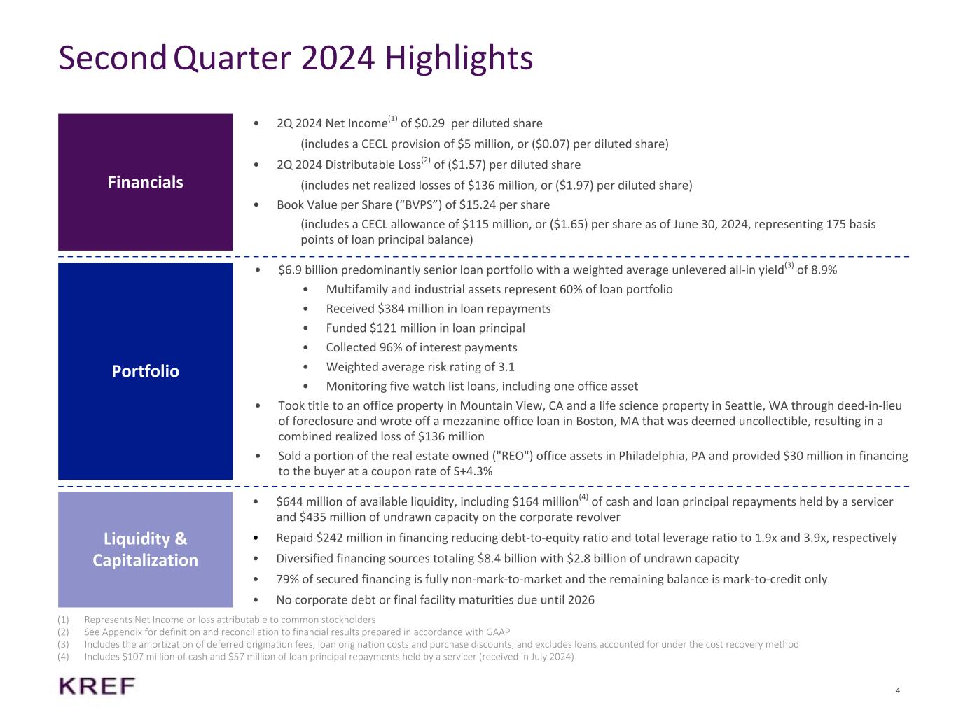 3 KKR Real Estate Finance Trust Inc. Overview Best In Class Portfolio Conservative Balance Sheet KREF’s Manager Fully Integrated with KKR $6.6 B Loan Portfolio 100% Senior Loans 60% Multifamily & Industrial $117 M Average Loan Size(1) 96% Interest Collected Senior loans secured primarily by transitional, institutional multifamily and industrial properties owned by high quality sponsors $8.4 B Financing Capacity 79% Fully Non-Mark-to-Market(2) Conservative liability management focused on diversified non-mark-to-market financing 14% KKR Ownership in KREF $644 M Current Liquidity(3) $578 B Global AUM(4) $71 B Real Estate AUM(4)(5) 140+ Real Estate Professionals(4) One firm culture that rewards investment discipline, creativity and determination and emphasizes the sharing of information, resources, expertise and best practices (1) Average loan size is inclusive of the unfunded commitment (2) Based on outstanding principal amount of secured financing, including non-consolidated senior interests. The remaining is subject to credit marks only (3) Includes $107 million of cash, $57 million of loan principal repayments held by a servicer (received in July 2024), $435 million undrawn corporate revolver capacity and $45 million of available borrowings based on existing collateral (4) As of March 31, 2024 (5) Figures represent AUM across all KKR real estate transactions
