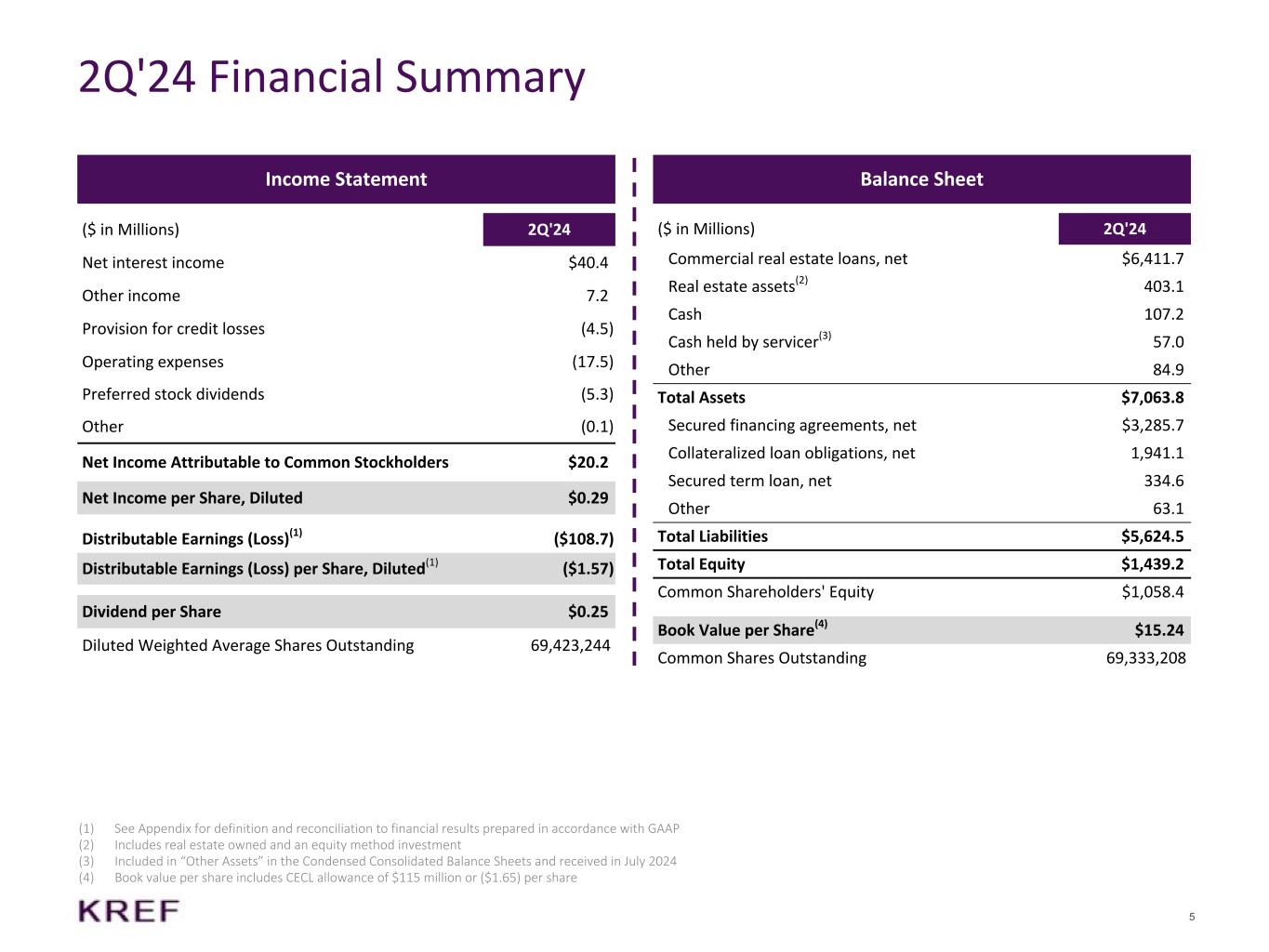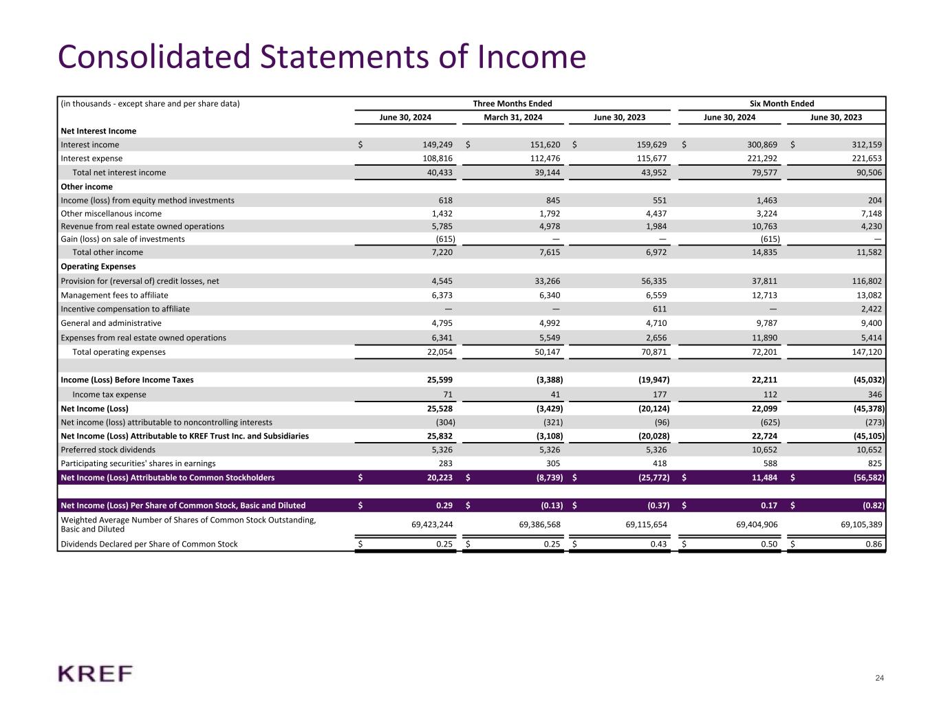 24 Consolidated Statements of Income (in thousands - except share and per share data) Three Months Ended Six Month Ended June 30, 2024 March 31, 2024 June 30, 2023 June 30, 2024 June 30, 2023 Net Interest Income Interest income $ 149,249 $ 151,620 $ 159,629 $ 300,869 $ 312,159 Interest expense 108,816 112,476 115,677 221,292 221,653 Total net interest income 40,433 39,144 43,952 79,577 90,506 Other income Income (loss) from equity method investments 618 845 551 1,463 204 Other miscellanous income 1,432 1,792 4,437 3,224 7,148 Revenue from real estate owned operations 5,785 4,978 1,984 10,763 4,230 Gain (loss) on sale of investments (615) — — (615) — Total other income 7,220 7,615 6,972 14,835 11,582 Operating Expenses Provision for (reversal of) credit losses, net 4,545 33,266 56,335 37,811 116,802 Management fees to affiliate 6,373 6,340 6,559 12,713 13,082 Incentive compensation to affiliate — — 611 — 2,422 General and administrative 4,795 4,992 4,710 9,787 9,400 Expenses from real estate owned operations 6,341 5,549 2,656 11,890 5,414 Total operating expenses 22,054 50,147 70,871 72,201 147,120 Income (Loss) Before Income Taxes 25,599 (3,388) (19,947) 22,211 (45,032) Income tax expense 71 41 177 112 346 Net Income (Loss) 25,528 (3,429) (20,124) 22,099 (45,378) Net income (loss) attributable to noncontrolling interests (304) (321) (96) (625) (273) Net Income (Loss) Attributable to KREF Trust Inc. and Subsidiaries 25,832 (3,108) (20,028) 22,724 (45,105) Preferred stock dividends 5,326 5,326 5,326 10,652 10,652 Participating securities' shares in earnings 283 305 418 588 825 Net Income (Loss) Attributable to Common Stockholders $ 20,223 $ (8,739) $ (25,772) $ 11,484 $ (56,582) Net Income (Loss) Per Share of Common Stock, Basic and Diluted $ 0.29 $ (0.13) $ (0.37) $ 0.17 $ (0.82) Weighted Average Number of Shares of Common Stock Outstanding, Basic and Diluted 69,423,244 69,386,568 69,115,654 69,404,906 69,105,389 Dividends Declared per Share of Common Stock $ 0.25 $ 0.25 $ 0.43 $ 0.50 $ 0.86