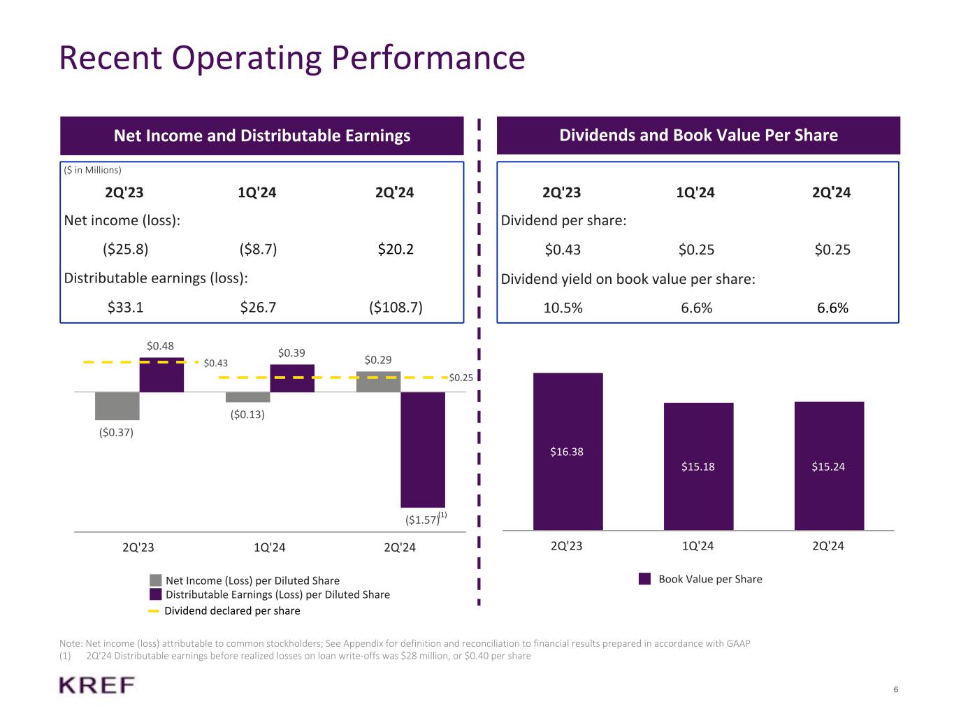 5 2Q'24 Financial Summary (1) See Appendix for definition and reconciliation to financial results prepared in accordance with GAAP (2) Includes real estate owned and an equity method investment (3) Included in “Other Assets” in the Condensed Consolidated Balance Sheets and received in July 2024 (4) Book value per share includes CECL allowance of $115 million or ($1.65) per share Income Statement ($ in Millions) 2Q'24 Net interest income $40.4 Other income 7.2 Provision for credit losses (4.5) Operating expenses (17.5) Preferred stock dividends (5.3) Other (0.1) Net Income Attributable to Common Stockholders $20.2 Net Income per Share, Diluted $0.29 Distributable Earnings (Loss)(1) ($108.7) Distributable Earnings (Loss) per Share, Diluted(1) ($1.57) Dividend per Share $0.25 Diluted Weighted Average Shares Outstanding 69,423,244 Balance Sheet ($ in Millions) 2Q'24 Commercial real estate loans, net $6,411.7 Real estate assets(2) 403.1 Cash 107.2 Cash held by servicer(3) 57.0 Other 84.9 Total Assets $7,063.8 Secured financing agreements, net $3,285.7 Collateralized loan obligations, net 1,941.1 Secured term loan, net 334.6 Other 63.1 Total Liabilities $5,624.5 Total Equity $1,439.2 Common Shareholders' Equity $1,058.4 Book Value per Share(4) $15.24 Common Shares Outstanding 69,333,208