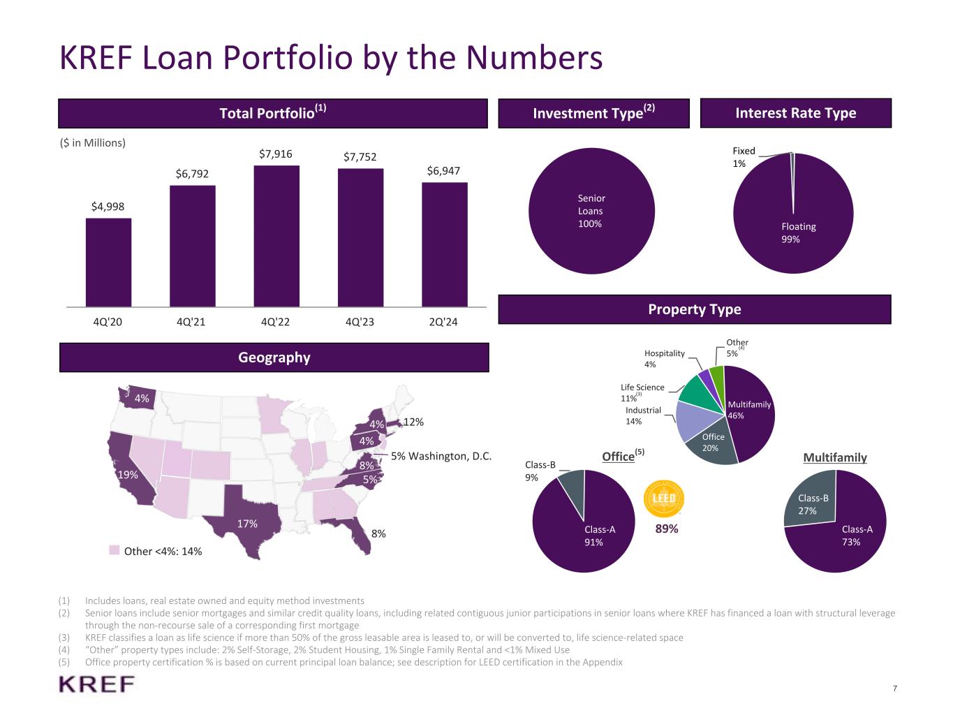 6 ($0.37) ($0.13) $0.29 $0.48 $0.39 ($1.57) Net Income (Loss) per Diluted Share Distributable Earnings (Loss) per Diluted Share 2Q'23 1Q'24 2Q'24 $0.25 Recent Operating Performance Note: Net income (loss) attributable to common stockholders; See Appendix for definition and reconciliation to financial results prepared in accordance with GAAP (1) 2Q'24 Distributable earnings before realized losses on loan write-offs was $28 million, or $0.40 per share Net Income and Distributable Earnings Dividends and Book Value Per Share ($ in Millions) 2Q'23 1Q'24 2Q'24 Net income (loss): ($25.8) ($8.7) $20.2 Distributable earnings (loss): $33.1 $26.7 ($108.7) 2Q'23 1Q'24 2Q'24 Dividend per share: $0.43 $0.25 $0.25 Dividend yield on book value per share: 10.5% 6.6% 6.6% $16.38 $15.18 $15.24 Book Value per Share 2Q'23 1Q'24 2Q'24 (1) $0.43 Dividend declared per share