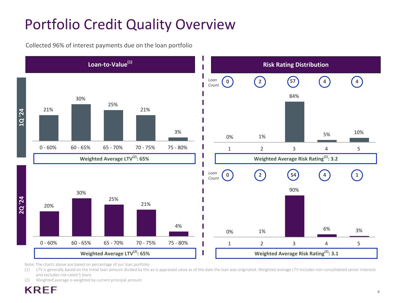 7 Class-A 73% Class-B 27% KREF Loan Portfolio by the Numbers (1) Includes loans, real estate owned and equity method investments (2) Senior loans include senior mortgages and similar credit quality loans, including related contiguous junior participations in senior loans where KREF has financed a loan with structural leverage through the non-recourse sale of a corresponding first mortgage (3) KREF classifies a loan as life science if more than 50% of the gross leasable area is leased to, or will be converted to, life science-related space (4) “Other” property types include: 2% Self-Storage, 2% Student Housing, 1% Single Family Rental and <1% Mixed Use (5) Office property certification % is based on current principal loan balance; see description for LEED certification in the Appendix Geography Investment Type(2) Property Type Interest Rate TypeTotal Portfolio(1) 4% 8% 8% 17% 19% 12% Other <4%: 14% ($ in Millions) 89% Office(5)5% Washington, D.C. $4,998 $6,792 $7,916 $7,752 $6,947 4Q'20 4Q'21 4Q'22 4Q'23 2Q'24 Senior Loans 100% Floating 99% Fixed 1% Multifamily Class-A 91% Class-B 9% Multifamily 46% Office 20% Industrial 14% Life Science 11% Hospitality 4% Other 5% (3) (4) 5% 4% 4%