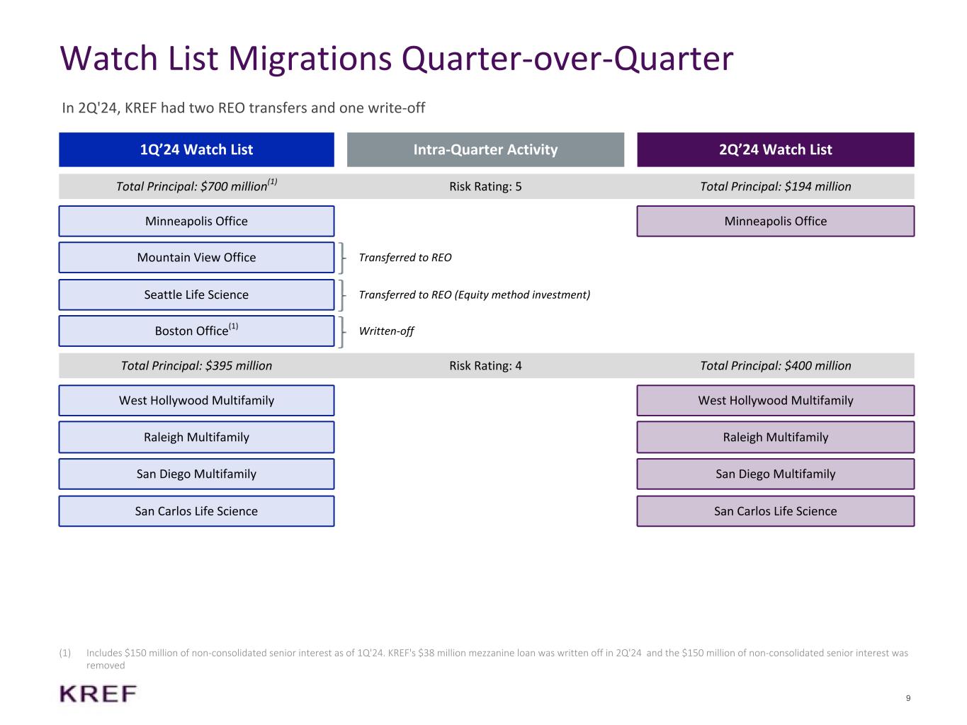 8 0% 1% 84% 5% 10% 1 2 3 4 5 Weighted Average Risk Rating(2): 3.1 Portfolio Credit Quality Overview Note: The charts above are based on percentage of our loan portfolio (1) LTV is generally based on the initial loan amount divided by the as-is appraised value as of the date the loan was originated. Weighted average LTV Includes non-consolidated senior interests and excludes risk-rated 5 loans (2) Weighted average is weighted by current principal amount Collected 96% of interest payments due on the loan portfolio Loan-to-Value(1) Risk Rating Distribution Weighted Average LTV(2): 65% Loan Count 2Q '2 4 Weighted Average LTV(2): 65% Weighted Average Risk Rating(2): 3.2 1Q '2 4 21% 30% 25% 21% 3% 0 - 60% 60 - 65% 65 - 70% 70 - 75% 75 - 80% 20% 30% 25% 21% 4% 0 - 60% 60 - 65% 65 - 70% 70 - 75% 75 - 80% 0 2 4 457 0 2 4 154Loan Count 0% 1% 90% 6% 3% 1 2 3 4 5