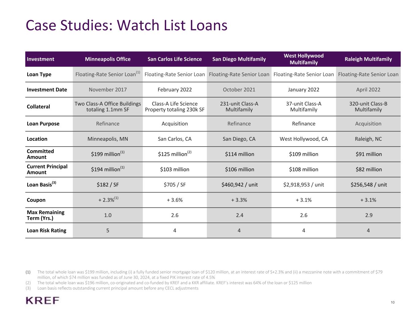9 Watch List Migrations Quarter-over-Quarter In 2Q'24, KREF had two REO transfers and one write-off 1Q’24 Watch List Intra-Quarter Activity 2Q’24 Watch List Total Principal: $700 million(1) Risk Rating: 5 Total Principal: $194 million Minneapolis Office Minneapolis Office Mountain View Office Transferred to REO Seattle Life Science Transferred to REO (Equity method investment) Boston Office(1) Written-off Total Principal: $395 million Risk Rating: 4 Total Principal: $400 million West Hollywood Multifamily West Hollywood Multifamily Raleigh Multifamily Raleigh Multifamily San Diego Multifamily San Diego Multifamily San Carlos Life Science San Carlos Life Science (1) Includes $150 million of non-consolidated senior interest as of 1Q'24. KREF's $38 million mezzanine loan was written off in 2Q'24 and the $150 million of non-consolidated senior interest was removed