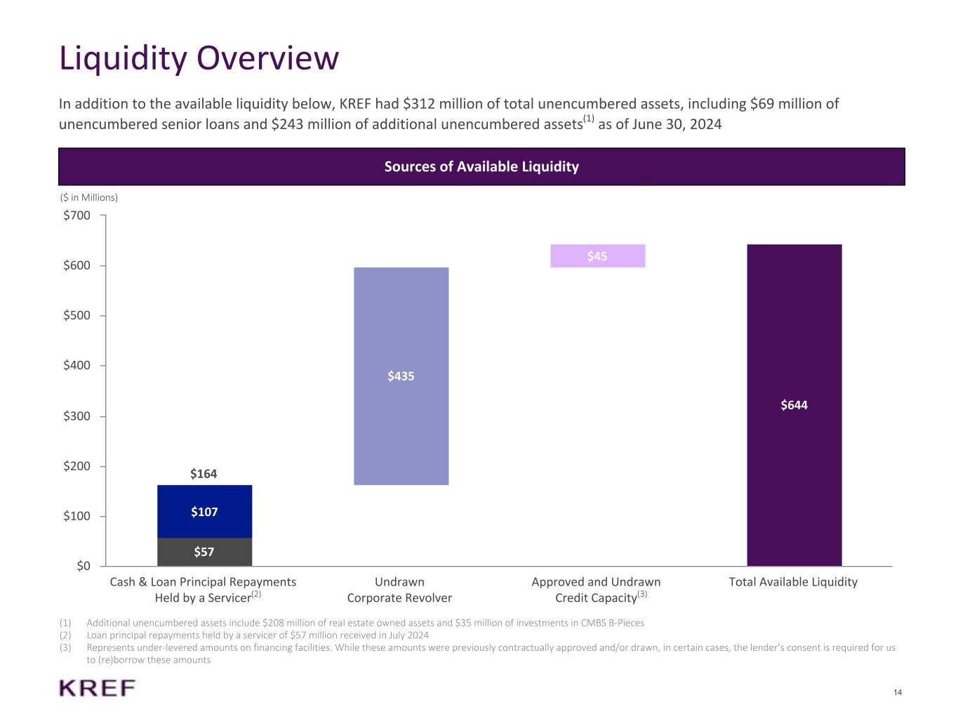 13 Financing Overview: Term Credit Facilities Counterparty Total or Weighted Average Drawn $571 $312 $310 $1,192 Capacity $1,000 $600 $400 $2,000 Collateral: Loans / Principal Balance 7 Loans / $792 8 Loans / $454 8 Loans / $479 23 Loans / $1,725 Final Stated Maturity(1) September 2026 March 2026 December 2027 - Weighted Average Pricing(2) +1.5% +2.1% +2.8% +2.0% Weighted Average Advance 72.1% 68.7% 64.6% 69.1% Mark-to-market Credit Only Credit Only Credit Only - ($ in Millions) (1) Based on extended maturity date (2) Weighted average pricing expressed as spread over Term SOFR (3) Based on principal balance of financing Property Type(3): Multifamily 36% Office 26% Life Science 17% Industrial 16% Single Family Rental 4% Mixed Use 2%