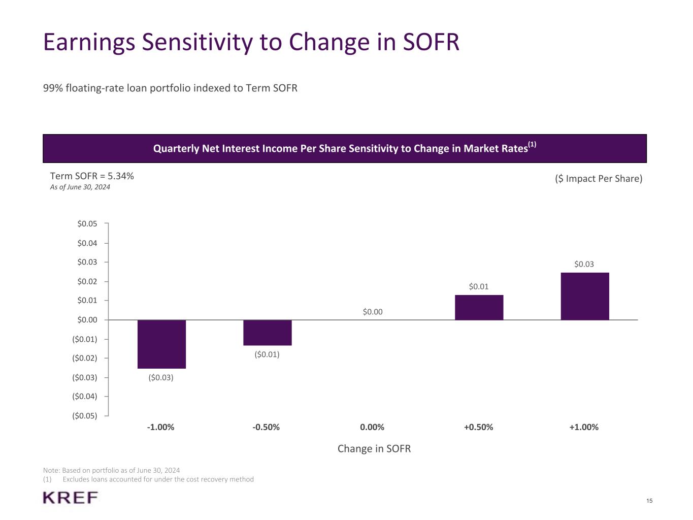 14 $164 $599 $57 $435 $45 $644 $107 Cash & Loan Principal Repayments Held by a Servicer Undrawn Corporate Revolver Approved and Undrawn Credit Capacity Total Available Liquidity $0 $100 $200 $300 $400 $500 $600 $700 Liquidity Overview (1) Additional unencumbered assets include $208 million of real estate owned assets and $35 million of investments in CMBS B-Pieces (2) Loan principal repayments held by a servicer of $57 million received in July 2024 (3) Represents under-levered amounts on financing facilities. While these amounts were previously contractually approved and/or drawn, in certain cases, the lender’s consent is required for us to (re)borrow these amounts ($ in Millions) Sources of Available Liquidity In addition to the available liquidity below, KREF had $312 million of total unencumbered assets, including $69 million of unencumbered senior loans and $243 million of additional unencumbered assets(1) as of June 30, 2024 (4) (3)(2) $164