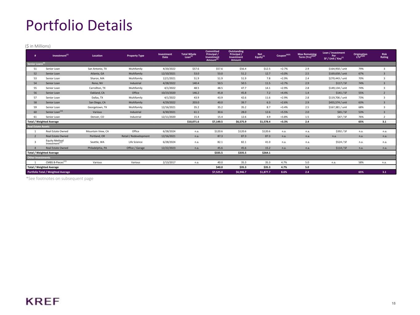 17 Portfolio Details ($ in Millions) # Investment(1) Location Property Type Investment Date Total Whole Loan(2) Committed Principal / Investment Amount(2) Outstanding Principal / Investment Amount Net Equity(3) Coupon(4)(5) Max Remaining Term (Yrs)(4)(6) Loan / Investment Per SF / Unit / Key(7) Origination LTV(4)(8) Risk Rating Senior Loans(9) 1 Senior Loan Arlington, VA Multifamily 9/30/2021 $381.0 $381.0 $371.9 $77.3 +3.3% 2.3 $335,049 / unit 69% 3 2 Senior Loan Boston, MA Life Science 8/3/2022 312.5 312.5 217.4 31.0 +4.2% 3.1 $747 / SF 56% 3 3 Senior Loan Bellevue, WA Office 9/13/2021 520.8 260.4 223.1 55.1 +3.7% 2.8 $851 / SF 63% 3 4 Senior Loan Various Industrial 4/28/2022 504.5 252.3 252.3 55.4 +2.7% 2.9 $98 / SF 64% 3 5 Senior Loan Bronx, NY Industrial 8/27/2021 381.2 228.7 201.9 46.3 +4.2% 2.2 $277 / SF 52% 3 6 Senior Loan Los Angeles, CA Multifamily 2/19/2021 220.0 220.0 220.0 33.8 +2.9% 1.7 $410,430 / unit 68% 3 7 Senior Loan Various Multifamily 5/31/2019 206.5 206.5 206.5 81.2 +4.0% 0.9 $192,991 / unit 74% 3 8 Senior Loan Minneapolis, MN Office 11/13/2017 199.4 199.4 194.4 89.0 +2.3% 1.0 $182 / SF n.a. 5 9 Senior Loan Various Industrial 6/15/2022 375.5 187.8 173.5 38.0 +2.9% 3.0 $135 / SF 50% 3 10 Senior Loan The Woodlands, TX Hospitality 9/15/2021 183.3 183.3 181.3 33.6 +4.3% 2.3 $199,402 / key 64% 3 11 Senior Loan Washington, D.C. Office 11/9/2021 181.0 181.0 170.7 62.3 +2.9% 3.4 $479 / SF 55% 3 12 Senior Loan West Palm Beach, FL Multifamily 12/29/2021 171.5 171.5 170.9 26.4 +2.8% 2.5 $210,456 / unit 73% 3 13 Senior Loan Various Self-Storage 12/21/2022 336.6 168.3 152.8 37.3 +3.8% 3.5 $22,966 / unit 64% 3 14 Senior Loan Boston, MA Life Science 4/27/2021 332.3 166.2 162.4 28.5 +3.7% 1.9 $674 / SF 66% 3 15 Senior Loan Plano, TX Office 2/6/2020 150.7 150.7 150.7 23.1 +2.8% 0.6 $208 / SF 64% 3 16 Senior Loan Redwood City, CA Life Science 9/30/2022 580.7 145.2 29.3 5.0 +4.5% 3.3 $885 / SF 53% 3 17 Senior Loan Dallas, TX Office 12/10/2021 138.0 138.0 138.0 28.6 +3.7% 2.4 $439 / SF 68% 3 18 Senior Loan Boston, MA Multifamily 3/29/2019 137.0 137.0 137.0 27.6 +3.4% 0.8 $351,282 / unit 63% 3 19 Senior Loan Arlington, VA Multifamily 1/20/2022 135.3 135.3 133.5 31.2 +2.9% 2.6 $445,071 / unit 65% 3 20 Senior Loan Fontana, CA Industrial 5/11/2021 132.0 132.0 119.1 52.6 +4.7% 1.9 $113 / SF 64% 3 21 Senior Loan San Carlos, CA Life Science 2/1/2022 195.9 125.0 103.2 31.0 +3.6% 2.6 $705 / SF 68% 4 22 Senior Loan Cambridge, MA Life Science 12/22/2021 401.3 115.7 93.1 24.3 +4.0% 2.5 $1,072 / SF 51% 3 23 Senior Loan Philadelphia, PA Office 6/19/2018 114.3 114.3 114.3 19.1 +2.8% 2.6 $117 / SF 71% 3 24 Senior Loan San Diego, CA Multifamily 10/20/2021 113.7 113.7 106.5 32.1 +3.3% 2.4 $460,942 / unit 71% 4 25 Senior Loan Pittsburgh, PA Student Housing 6/8/2021 112.5 112.5 112.5 17.4 +3.0% 1.9 $155,602 / unit 74% 3 26 Senior Loan West Hollywood, CA Multifamily 1/26/2022 109.2 109.2 108.0 21.8 +3.1% 2.6 $2,918,953 / unit 65% 4 27 Senior Loan Chicago, IL Office 7/15/2019 105.0 105.0 88.4 36.3 +2.3% 4.1 $85 / SF 59% 3 28 Senior Loan Las Vegas, NV Multifamily 12/28/2021 101.1 101.1 101.1 15.3 +2.8% 2.5 $191,460 / unit 61% 3 29 Senior Loan Boston, MA Industrial 6/28/2022 285.5 100.0 99.3 20.6 +3.0% 3.0 $198 / SF 52% 3 30 Senior Loan Cary, NC Multifamily 11/21/2022 100.0 100.0 95.3 18.5 +3.4% 3.4 $244,275 / unit 63% 3 31 Senior Loan Washington, D.C. Office 1/13/2022 228.5 100.0 80.4 12.1 +3.3% 3.6 $294 / SF 55% 3 32 Senior Loan Orlando, FL Multifamily 12/14/2021 97.4 97.4 94.3 24.7 +3.1% 2.5 $248,841 / unit 74% 3 33 Senior Loan Brisbane, CA Life Science 7/22/2021 95.0 95.0 90.8 20.4 +3.1% 2.1 $784 / SF 71% 3 34 Senior Loan Raleigh, NC Multifamily 4/27/2022 91.5 91.5 82.1 22.8 +3.1% 2.9 $256,548 / unit 68% 4 35 Senior Loan Brandon, FL Multifamily 1/13/2022 90.3 90.3 68.4 15.2 +3.1% 2.6 $194,779 / unit 75% 3 36 Senior Loan Dallas, TX Multifamily 12/23/2021 90.0 90.0 80.8 17.9 +2.9% 2.5 $248,482 / unit 67% 3 37 Senior Loan Miami, FL Multifamily 10/14/2021 89.5 89.5 89.5 17.0 +2.9% 2.4 $304,422 / unit 76% 3 38 Senior Loan Dallas, TX Office 1/22/2021 87.0 87.0 87.0 13.4 +3.4% 1.6 $294 / SF 65% 3 39 Senior Loan San Antonio, TX Multifamily 6/1/2022 246.5 86.3 80.3 19.9 +2.8% 2.9 $103,007 / unit 68% 3 40 Senior Loan Scottsdale, AZ Multifamily 5/9/2022 169.0 84.5 84.5 13.1 +2.9% 2.9 $457,995 / unit 64% 3 41 Senior Loan Philadelphia, PA Mixed Use 6/28/2024 83.7 83.7 30.1 10.5 +4.3% 5.0 $59 / SF 66% 3 42 Senior Loan Hollywood, FL Multifamily 12/20/2021 81.0 81.0 81.0 15.2 +3.1% 2.5 $327,935 / unit 74% 3 43 Senior Loan Charlotte, NC Multifamily 12/14/2021 79.3 79.3 77.0 11.7 +3.1% 2.5 $209,168 / unit 74% 3 44 Senior Loan Phoenix, AZ Single Family Rental 4/22/2021 72.1 72.1 70.6 20.8 +4.9% 1.9 $157,092 / unit 50% 3 45 Senior Loan Denver, CO Multifamily 9/14/2021 70.3 70.3 70.3 10.7 +2.8% 2.3 $290,496 / unit 78% 3 46 Senior Loan Washington, D.C. Multifamily 12/4/2020 69.0 69.0 66.8 66.8 +3.6% 1.4 $267,000 / unit 63% 3 47 Senior Loan Plano, TX Multifamily 3/31/2022 67.8 67.8 67.4 24.1 +2.8% 2.8 $253,226 / unit 75% 3 48 Senior Loan Nashville, TN Hospitality 12/9/2021 66.0 66.0 64.8 10.3 +3.7% 2.5 $281,672 / key 68% 3 49 Senior Loan Dallas, TX Multifamily 8/18/2021 63.1 63.1 63.1 11.5 +3.9% 2.2 $175,278 / unit 70% 3 50 Senior Loan Durham, NC Multifamily 12/15/2021 60.0 60.0 56.9 10.6 +3.0% 2.5 $164,887 / unit 67% 3 *See footnotes on subsequent page