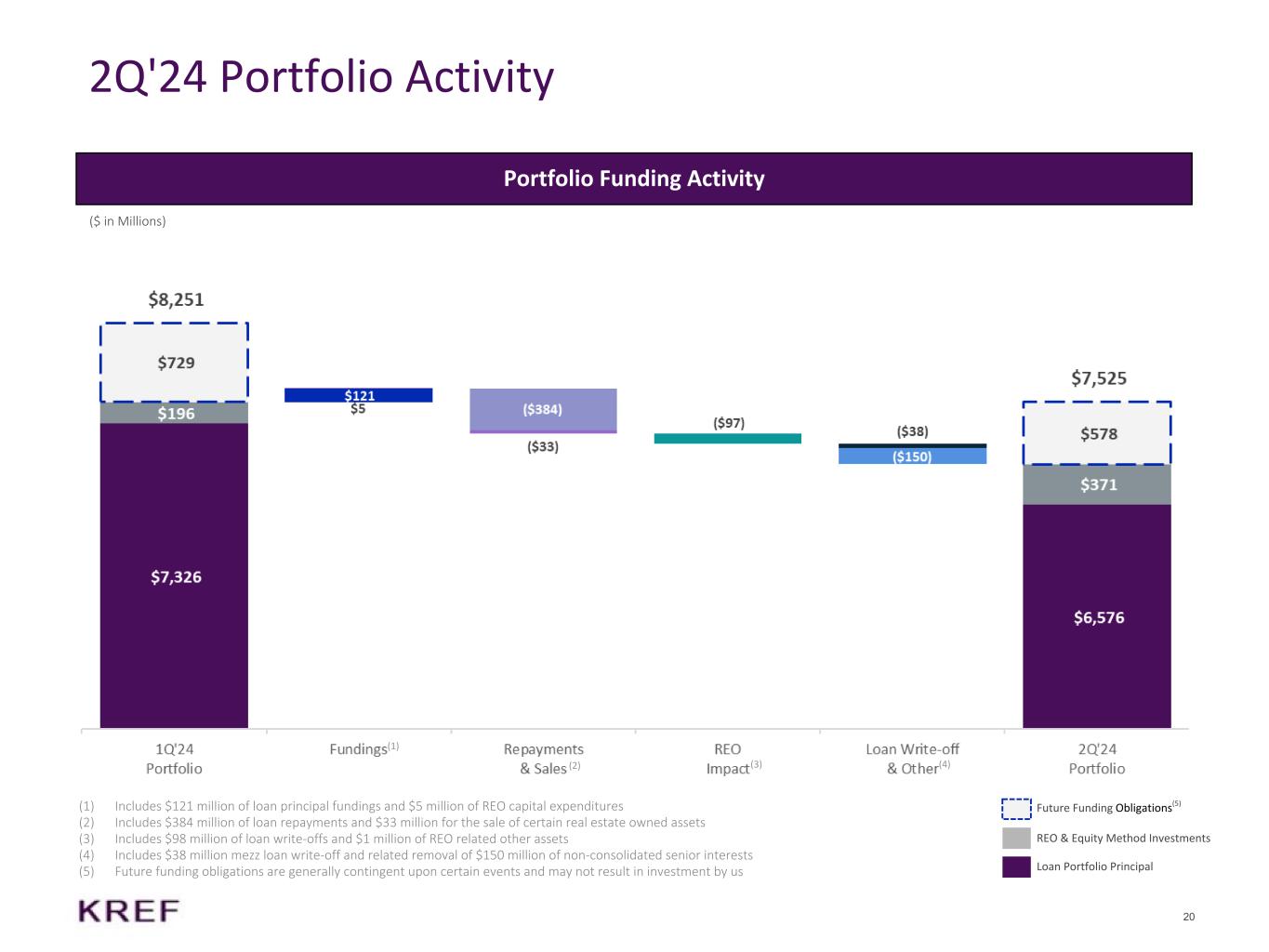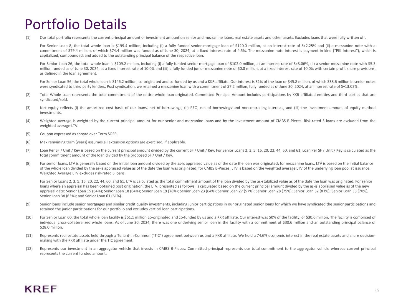 19 Portfolio Details (1) Our total portfolio represents the current principal amount or investment amount on senior and mezzanine loans, real estate assets and other assets. Excludes loans that were fully written off. For Senior Loan 8, the total whole loan is $199.4 million, including (i) a fully funded senior mortgage loan of $120.0 million, at an interest rate of S+2.25% and (ii) a mezzanine note with a commitment of $79.4 million, of which $74.4 million was funded as of June 30, 2024, at a fixed interest rate of 4.5%. The mezzanine note interest is payment-in-kind (“PIK Interest”), which is capitalized, compounded, and added to the outstanding principal balance of the respective loan. For Senior Loan 26, the total whole loan is $109.2 million, including (i) a fully funded senior mortgage loan of $102.0 million, at an interest rate of S+3.06%, (ii) a senior mezzanine note with $5.3 million funded as of June 30, 2024, at a fixed interest rate of 10.0% and (iii) a fully funded junior mezzanine note of $0.8 million, at a fixed interest rate of 10.0% with certain profit share provisions, as defined in the loan agreement. For Senior Loan 56, the total whole loan is $146.2 million, co-originated and co-funded by us and a KKR affiliate. Our interest is 31% of the loan or $45.8 million, of which $38.6 million in senior notes were syndicated to third party lenders. Post syndication, we retained a mezzanine loan with a commitment of $7.2 million, fully funded as of June 30, 2024, at an interest rate of S+13.02%. (2) Total Whole Loan represents the total commitment of the entire whole loan originated. Committed Principal Amount includes participations by KKR affiliated entities and third parties that are syndicated/sold. (3) Net equity reflects (i) the amortized cost basis of our loans, net of borrowings; (ii) REO, net of borrowings and noncontrolling interests, and (iii) the investment amount of equity method investments. (4) Weighted average is weighted by the current principal amount for our senior and mezzanine loans and by the investment amount of CMBS B-Pieces. Risk-rated 5 loans are excluded from the weighted average LTV. (5) Coupon expressed as spread over Term SOFR. (6) Max remaining term (years) assumes all extension options are exercised, if applicable. (7) Loan Per SF / Unit / Key is based on the current principal amount divided by the current SF / Unit / Key. For Senior Loans 2, 3, 5, 16, 20, 22, 44, 60, and 61, Loan Per SF / Unit / Key is calculated as the total commitment amount of the loan divided by the proposed SF / Unit / Key. (8) For senior loans, LTV is generally based on the initial loan amount divided by the as-is appraised value as of the date the loan was originated; for mezzanine loans, LTV is based on the initial balance of the whole loan divided by the as-is appraised value as of the date the loan was originated; for CMBS B-Pieces, LTV is based on the weighted average LTV of the underlying loan pool at issuance. Weighted Average LTV excludes risk-rated 5 loans. For Senior Loans 2, 3, 5, 16, 20, 22, 44, 60, and 61, LTV is calculated as the total commitment amount of the loan divided by the as-stabilized value as of the date the loan was originated. For senior loans where an appraisal has been obtained post origination, the LTV, presented as follows, is calculated based on the current principal amount divided by the as-is appraised value as of the new appraisal date: Senior Loan 15 (64%); Senior Loan 18 (64%); Senior Loan 19 (78%); Senior Loan 23 (64%); Senior Loan 27 (57%); Senior Loan 28 (75%); Senior Loan 32 (83%); Senior Loan 33 (70%), Senior Loan 38 (63%); and Senior Loan 61 (61%). (9) Senior loans include senior mortgages and similar credit quality investments, including junior participations in our originated senior loans for which we have syndicated the senior participations and retained the junior participations for our portfolio and excludes vertical loan participations. (10) For Senior Loan 60, the total whole loan facility is $61.1 million co-originated and co-funded by us and a KKR affiliate. Our interest was 50% of the facility, or $30.6 million. The facility is comprised of individual cross-collateralized whole loans. As of June 30, 2024, there was one underlying senior loan in the facility with a commitment of $30.6 million and an outstanding principal balance of $28.0 million. (11) Represents real estate assets held through a Tenant-in-Common ("TIC") agreement between us and a KKR affiliate. We hold a 74.6% economic interest in the real estate assets and share decision- making with the KKR affiliate under the TIC agreement. (12) Represents our investment in an aggregator vehicle that invests in CMBS B-Pieces. Committed principal represents our total commitment to the aggregator vehicle whereas current principal represents the current funded amount.