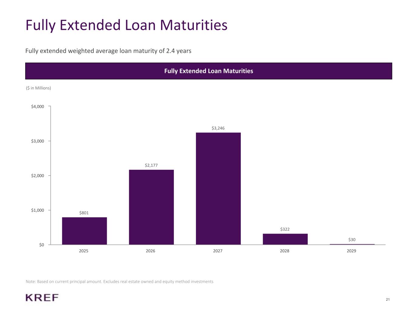 20 2Q'24 Portfolio Activity (1) Includes $121 million of loan principal fundings and $5 million of REO capital expenditures (2) Includes $384 million of loan repayments and $33 million for the sale of certain real estate owned assets (3) Includes $98 million of loan write-offs and $1 million of REO related other assets (4) Includes $38 million mezz loan write-off and related removal of $150 million of non-consolidated senior interests (5) Future funding obligations are generally contingent upon certain events and may not result in investment by us Portfolio Funding Activity Future Funding Obligations(5) ($ in Millions) REO & Equity Method Investments Loan Portfolio Principal (1) (2) (3) (4)