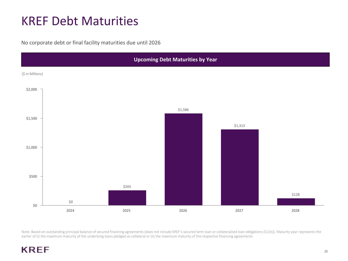 22 KREF Debt Maturities Note: Based on outstanding principal balance of secured financing agreements (does not include KREF’s secured term loan or collateralized loan obligations (CLOs)). Maturity year represents the earlier of (i) the maximum maturity of the underlying loans pledged as collateral or (ii) the maximum maturity of the respective financing agreements Upcoming Debt Maturities by Year ($ in Millions) $0 $265 $1,586 $1,313 $128 2024 2025 2026 2027 2028 $0 $500 $1,000 $1,500 $2,000 No corporate debt or final facility maturities due until 2026