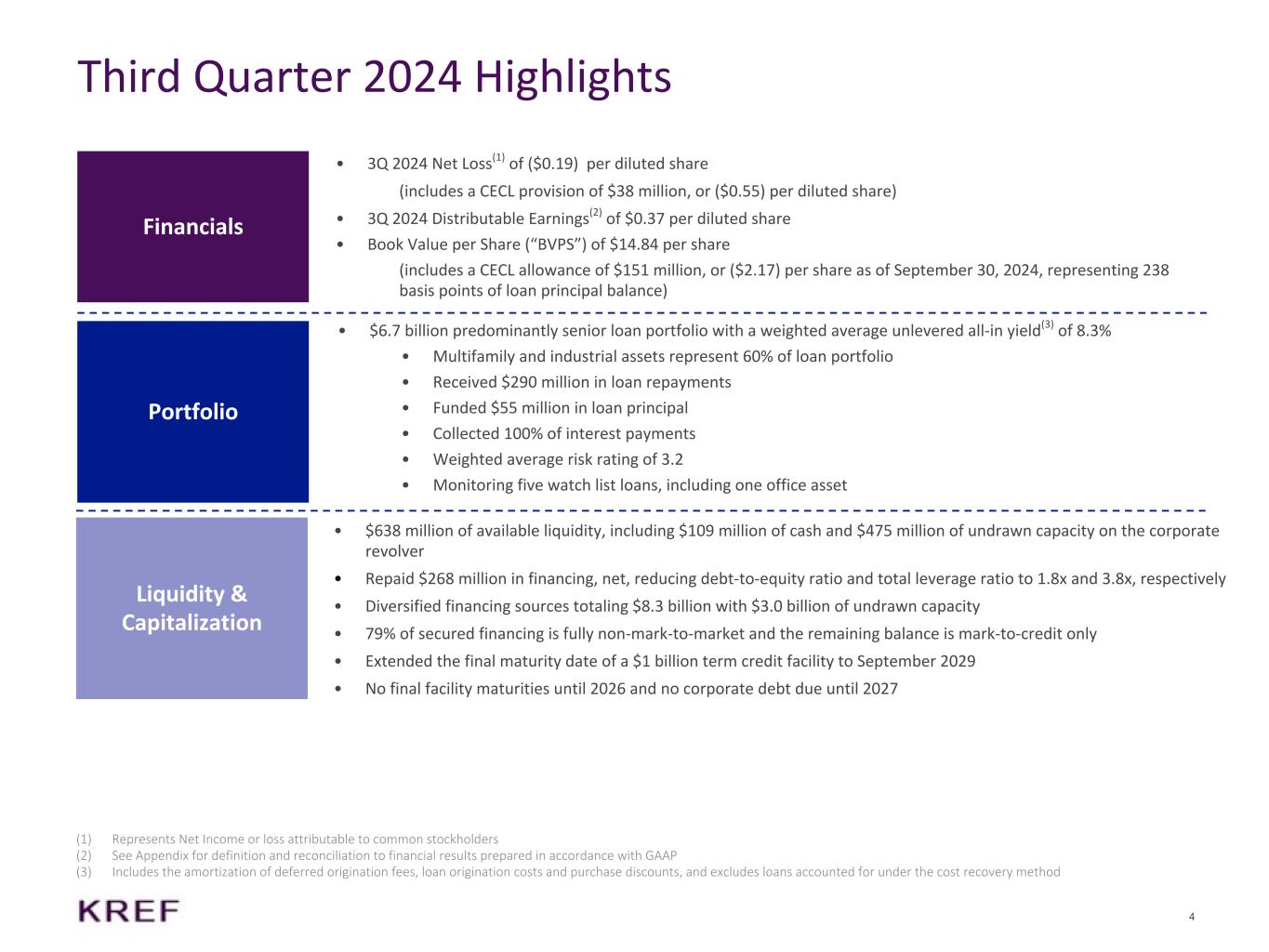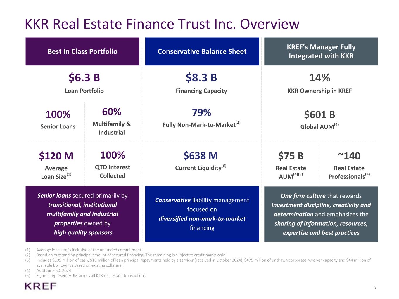 2 Legal Disclosures This presentation has been prepared for KKR Real Estate Finance Trust Inc. (NYSE: KREF) for the benefit of its stockholders. This presentation is solely for informational purposes in connection with evaluating the business, operations and financial results of KKR Real Estate Finance Trust Inc. and its subsidiaries (collectively, "KREF“ or the “Company”). This presentation is not and shall not be construed as an offer to purchase or sell, or the solicitation of an offer to purchase or sell, any securities, any investment advice or any other service by KREF. Nothing in this presentation constitutes the provision of any tax, accounting, financial, investment, regulatory, legal or other advice by KREF or its advisors. This presentation may not be referenced, quoted or linked by website by any third party, in whole or in part, except as agreed to in writing by KREF. This presentation contains forward-looking statements within the meaning of Section 27A of the Securities Act of 1933, as amended, and Section 21E of the Securities Exchange Act of 1934, as amended, which reflect the Company’s current views with respect to, among other things, its future operations and financial performance. You can identify these forward looking statements by the use of words such as “outlook,” “believe,” “expect,” “potential,” “continue,” “may,” “should,” “seek,” “approximately,” “predict,” “intend,” “will,” “plan,” “estimate,” “anticipate,” the negative version of these words, other comparable words or other statements that do not relate strictly to historical or factual matters. By their nature, forward-looking statements speak only as of the date they are made, are not statements of historical fact or guarantees of future performance and are subject to risks, uncertainties, assumptions or changes in circumstances that are difficult to predict or quantify. The forward-looking statements are based on the Company’s beliefs, assumptions and expectations, taking into account all information currently available to it. These beliefs, assumptions and expectations can change as a result of many possible events or factors, not all of which are known to the Company or are within its control. Such forward-looking statements are subject to various risks and uncertainties, including, among other things: the general political, economic, competitive, and other conditions in the United States and in any foreign jurisdictions in which we invest; global economic trends and conditions, including heightened inflation, slower growth or recession, changes to fiscal and monetary policy, fluctuations in interest rates and credit spreads, labor shortages, currency fluctuations and challenges in global supply chains; deterioration in the performance of the properties securing our investments; difficulty accessing financing or raising capital; and the risks, uncertainties and factors set forth under Part I-Item 1A. “Risk Factors” of the Company’s Annual Report on Form 10-K for the fiscal year ended December 31, 2023, as such factors may be updated from time to time in the Company’s periodic filings with the SEC, which are accessible on the SEC’s website at www.sec.gov. Accordingly, there are or will be important factors that could cause actual outcomes or results to differ materially from those indicated in this release. These factors should not be construed as exhaustive and should be read in conjunction with the other cautionary statements and information included in this release and in the Company’s filings with the SEC. All forward-looking statements in this release speak only as of the date of this release. The Company undertakes no obligation to publicly update or review any forward-looking statements, whether as a result of new information, future developments or otherwise, except as required by law. All forward looking statements in this presentation speak only as of October 21, 2024. KREF undertakes no obligation to publicly update or review any forward-looking statements, whether as a result of new information, future developments or otherwise, except as required by law. All financial information in this presentation is as of September 30, 2024 unless otherwise indicated. This presentation also includes non-GAAP financial measures, including Distributable Earnings and Distributable Earnings per Diluted Share. Such non-GAAP financial measures should be considered only as supplemental to, and not as superior to, financial measures prepared in accordance with U.S. GAAP. Please refer to the Appendix of this presentation for a reconciliation of the non-GAAP financial measures included in this presentation to the most directly comparable financial measures prepared in accordance with U.S. GAAP.