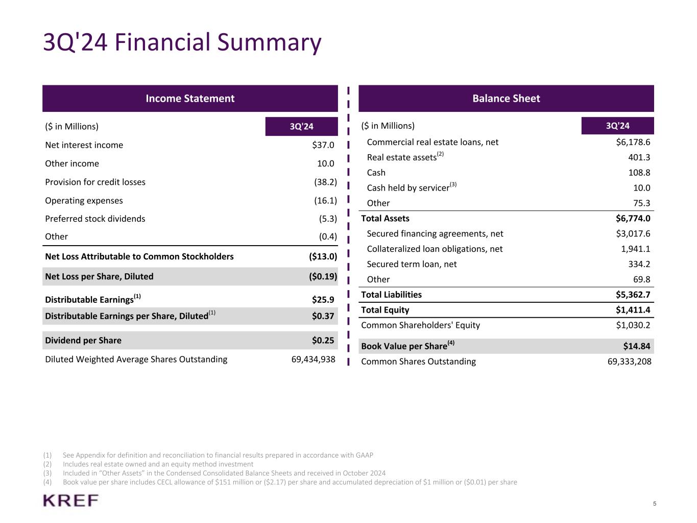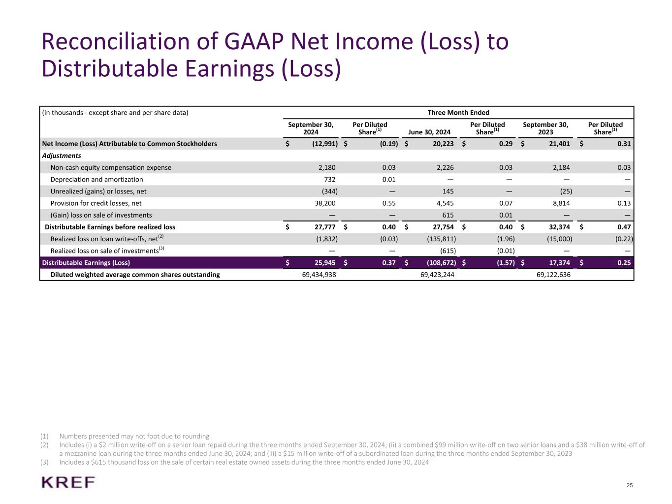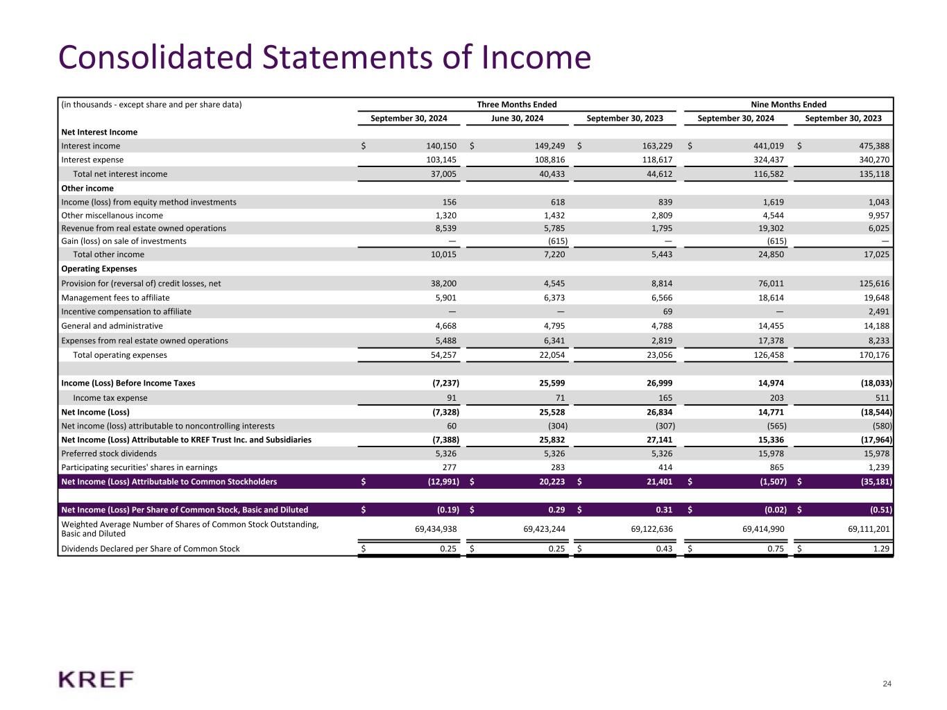 24 Consolidated Statements of Income (in thousands - except share and per share data) Three Months Ended Nine Months Ended September 30, 2024 June 30, 2024 September 30, 2023 September 30, 2024 September 30, 2023 Net Interest Income Interest income $ 140,150 $ 149,249 $ 163,229 $ 441,019 $ 475,388 Interest expense 103,145 108,816 118,617 324,437 340,270 Total net interest income 37,005 40,433 44,612 116,582 135,118 Other income Income (loss) from equity method investments 156 618 839 1,619 1,043 Other miscellanous income 1,320 1,432 2,809 4,544 9,957 Revenue from real estate owned operations 8,539 5,785 1,795 19,302 6,025 Gain (loss) on sale of investments — (615) — (615) — Total other income 10,015 7,220 5,443 24,850 17,025 Operating Expenses Provision for (reversal of) credit losses, net 38,200 4,545 8,814 76,011 125,616 Management fees to affiliate 5,901 6,373 6,566 18,614 19,648 Incentive compensation to affiliate — — 69 — 2,491 General and administrative 4,668 4,795 4,788 14,455 14,188 Expenses from real estate owned operations 5,488 6,341 2,819 17,378 8,233 Total operating expenses 54,257 22,054 23,056 126,458 170,176 Income (Loss) Before Income Taxes (7,237) 25,599 26,999 14,974 (18,033) Income tax expense 91 71 165 203 511 Net Income (Loss) (7,328) 25,528 26,834 14,771 (18,544) Net income (loss) attributable to noncontrolling interests 60 (304) (307) (565) (580) Net Income (Loss) Attributable to KREF Trust Inc. and Subsidiaries (7,388) 25,832 27,141 15,336 (17,964) Preferred stock dividends 5,326 5,326 5,326 15,978 15,978 Participating securities' shares in earnings 277 283 414 865 1,239 Net Income (Loss) Attributable to Common Stockholders $ (12,991) $ 20,223 $ 21,401 $ (1,507) $ (35,181) Net Income (Loss) Per Share of Common Stock, Basic and Diluted $ (0.19) $ 0.29 $ 0.31 $ (0.02) $ (0.51) Weighted Average Number of Shares of Common Stock Outstanding, Basic and Diluted 69,434,938 69,423,244 69,122,636 69,414,990 69,111,201 Dividends Declared per Share of Common Stock $ 0.25 $ 0.25 $ 0.43 $ 0.75 $ 1.29