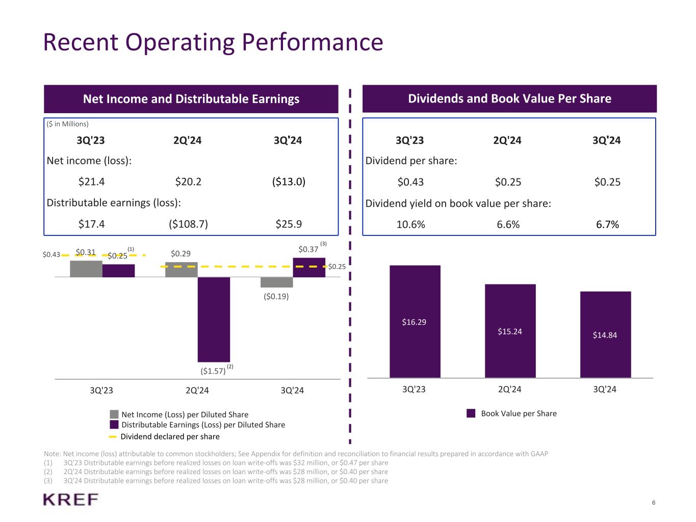 5 3Q'24 Financial Summary (1) See Appendix for definition and reconciliation to financial results prepared in accordance with GAAP (2) Includes real estate owned and an equity method investment (3) Included in “Other Assets” in the Condensed Consolidated Balance Sheets and received in October 2024 (4) Book value per share includes CECL allowance of $151 million or ($2.17) per share and accumulated depreciation of $1 million or ($0.01) per share Income Statement ($ in Millions) 3Q'24 Net interest income $37.0 Other income 10.0 Provision for credit losses (38.2) Operating expenses (16.1) Preferred stock dividends (5.3) Other (0.4) Net Loss Attributable to Common Stockholders ($13.0) Net Loss per Share, Diluted ($0.19) Distributable Earnings(1) $25.9 Distributable Earnings per Share, Diluted(1) $0.37 Dividend per Share $0.25 Diluted Weighted Average Shares Outstanding 69,434,938 Balance Sheet ($ in Millions) 3Q'24 Commercial real estate loans, net $6,178.6 Real estate assets(2) 401.3 Cash 108.8 Cash held by servicer(3) 10.0 Other 75.3 Total Assets $6,774.0 Secured financing agreements, net $3,017.6 Collateralized loan obligations, net 1,941.1 Secured term loan, net 334.2 Other 69.8 Total Liabilities $5,362.7 Total Equity $1,411.4 Common Shareholders' Equity $1,030.2 Book Value per Share(4) $14.84 Common Shares Outstanding 69,333,208