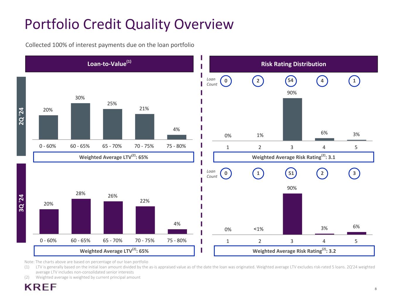 7 Class-A 73% Class-B 27% KREF Loan Portfolio by the Numbers (1) Includes loans, real estate owned and equity method investments (2) KREF classifies a loan as life science if more than 50% of the gross leasable area is leased to, or will be converted to, life science-related space (3) “Other” property types include: 2% Self-Storage, 2% Student Housing and <1% Mixed Use (4) Office property certification % is based on current principal loan balance; see description for LEED certification in the Appendix Geography Investment Type Property Type Interest Rate TypeTotal Portfolio(1) 4% 8% 8% 16% 19% 12% Other <4%: 16% ($ in Millions) 89% Office(4)4% Washington, D.C. $4,998 $6,792 $7,916 $7,752 $6,711 4Q'20 4Q'21 4Q'22 4Q'23 3Q'24 Senior Loans 100% Floating 99% Fixed 1% Multifamily Class-A 91% Class-B 9% Multifamily 45% Office 20% Industrial 15% Life Science 11% Hospitality 4% Other 5% (2) (3) 5% 4% 4%