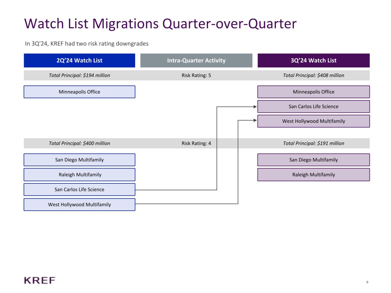 8 0% 1% 90% 6% 3% 1 2 3 4 5 Weighted Average Risk Rating(2): 3.2 Portfolio Credit Quality Overview Note: The charts above are based on percentage of our loan portfolio (1) LTV is generally based on the initial loan amount divided by the as-is appraised value as of the date the loan was originated. Weighted average LTV excludes risk-rated 5 loans. 2Q'24 weighted average LTV includes non-consolidated senior interests (2) Weighted average is weighted by current principal amount Collected 100% of interest payments due on the loan portfolio Loan-to-Value(1) Risk Rating Distribution Weighted Average LTV(2): 65% Loan Count 3Q '2 4 Weighted Average LTV(2): 65% Weighted Average Risk Rating(2): 3.1 2Q '2 4 20% 30% 25% 21% 4% 0 - 60% 60 - 65% 65 - 70% 70 - 75% 75 - 80% 20% 28% 26% 22% 4% 0 - 60% 60 - 65% 65 - 70% 70 - 75% 75 - 80% 0 2 4 154 0 1 2 351Loan Count 0% 1% 90% 3% 6% 1 2 3 4 5 <