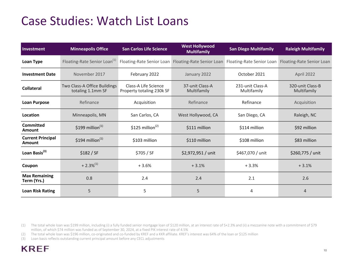 9 Watch List Migrations Quarter-over-Quarter In 3Q'24, KREF had two risk rating downgrades 2Q’24 Watch List Intra-Quarter Activity 3Q’24 Watch List Total Principal: $194 million Risk Rating: 5 Total Principal: $408 million Minneapolis Office Minneapolis Office San Carlos Life Science West Hollywood Multifamily Total Principal: $400 million Risk Rating: 4 Total Principal: $191 million San Diego Multifamily San Diego Multifamily Raleigh Multifamily Raleigh Multifamily San Carlos Life Science West Hollywood Multifamily