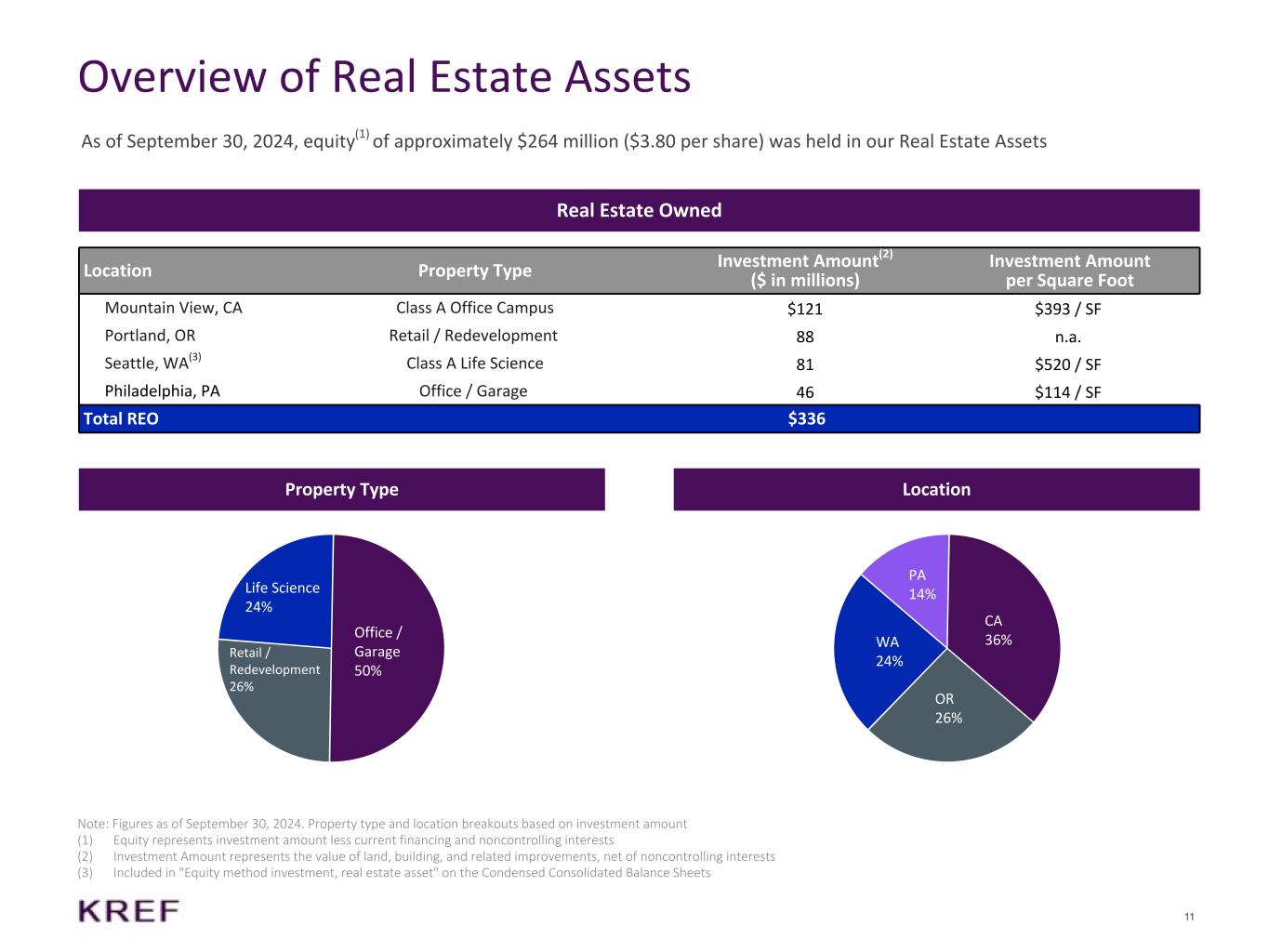 10 Case Studies: Watch List Loans Investment Minneapolis Office San Carlos Life Science West Hollywood Multifamily San Diego Multifamily Raleigh Multifamily Loan Type Floating-Rate Senior Loan(1) Floating-Rate Senior Loan Floating-Rate Senior Loan Floating-Rate Senior Loan Floating-Rate Senior Loan Investment Date November 2017 February 2022 January 2022 October 2021 April 2022 Collateral Two Class-A Office Buildings totaling 1.1mm SF Class-A Life Science Property totaling 230k SF 37-unit Class-A Multifamily 231-unit Class-A Multifamily 320-unit Class-B Multifamily Loan Purpose Refinance Acquisition Refinance Refinance Acquisition Location Minneapolis, MN San Carlos, CA West Hollywood, CA San Diego, CA Raleigh, NC Committed Amount $199 million(1) $125 million(2) $111 million $114 million $92 million Current Principal Amount $194 million(1) $103 million $110 million $108 million $83 million Loan Basis(3) $182 / SF $705 / SF $2,972,951 / unit $467,070 / unit $260,775 / unit Coupon + 2.3%(1) + 3.6% + 3.1% + 3.3% + 3.1% Max Remaining Term (Yrs.) 0.8 2.4 2.4 2.1 2.6 Loan Risk Rating 5 5 5 4 4 (1) The total whole loan was $199 million, including (i) a fully funded senior mortgage loan of $120 million, at an interest rate of S+2.3% and (ii) a mezzanine note with a commitment of $79 million, of which $74 million was funded as of September 30, 2024, at a fixed PIK interest rate of 4.5% (2) The total whole loan was $196 million, co-originated and co-funded by KREF and a KKR affiliate. KREF’s interest was 64% of the loan or $125 million (3) Loan basis reflects outstanding current principal amount before any CECL adjustments