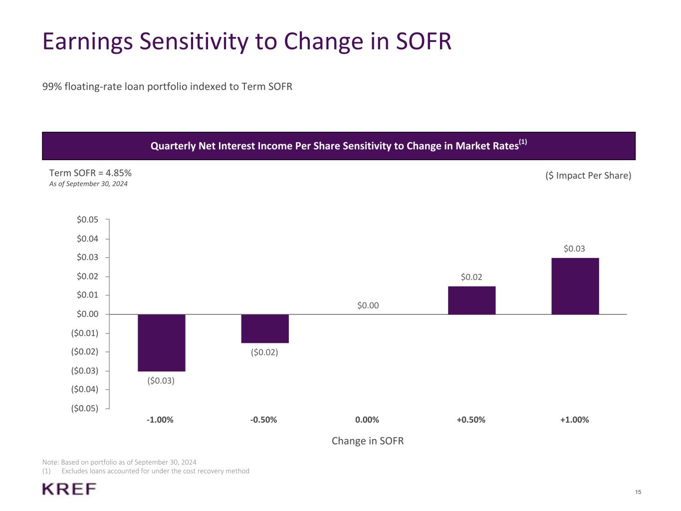 14 $119 $594 $10 $475 $44 $638 $109 Cash & Loan Principal Repayments Held by a Servicer Undrawn Corporate Revolver Approved and Undrawn Credit Capacity Total Available Liquidity $0 $100 $200 $300 $400 $500 $600 $700 Liquidity Overview (1) Additional unencumbered assets include $208 million of real estate owned assets and $35 million of investments in CMBS B-Pieces (2) Loan principal repayments held by a servicer of $10 million received in October 2024 (3) Represents under-levered amounts on financing facilities. While these amounts were previously contractually approved and/or drawn, in certain cases, the lender’s consent is required for us to (re)borrow these amounts ($ in Millions) Sources of Available Liquidity In addition to the available liquidity below, KREF had $337 million of total unencumbered assets, including $93 million of unencumbered senior loans and $244 million of additional unencumbered assets(1) as of September 30, 2024 (4) (3)(2) $119