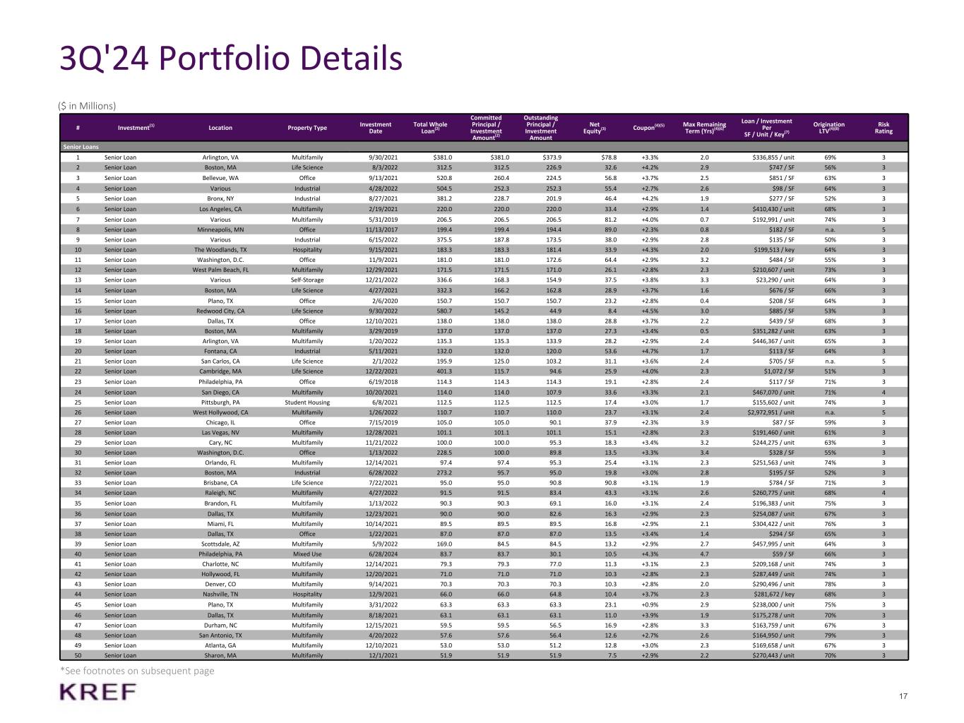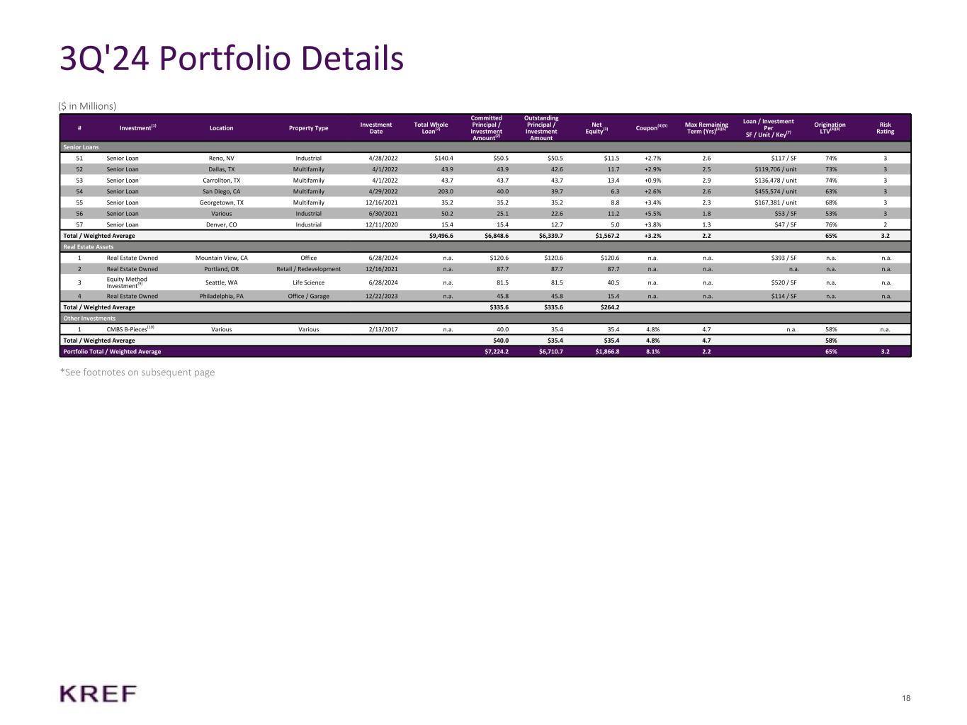 17 3Q'24 Portfolio Details ($ in Millions) # Investment(1) Location Property Type Investment Date Total Whole Loan(2) Committed Principal / Investment Amount(2) Outstanding Principal / Investment Amount Net Equity(3) Coupon(4)(5) Max Remaining Term (Yrs)(4)(6) Loan / Investment Per SF / Unit / Key(7) Origination LTV(4)(8) Risk Rating Senior Loans 1 Senior Loan Arlington, VA Multifamily 9/30/2021 $381.0 $381.0 $373.9 $78.8 +3.3% 2.0 $336,855 / unit 69% 3 2 Senior Loan Boston, MA Life Science 8/3/2022 312.5 312.5 226.9 32.6 +4.2% 2.9 $747 / SF 56% 3 3 Senior Loan Bellevue, WA Office 9/13/2021 520.8 260.4 224.5 56.8 +3.7% 2.5 $851 / SF 63% 3 4 Senior Loan Various Industrial 4/28/2022 504.5 252.3 252.3 55.4 +2.7% 2.6 $98 / SF 64% 3 5 Senior Loan Bronx, NY Industrial 8/27/2021 381.2 228.7 201.9 46.4 +4.2% 1.9 $277 / SF 52% 3 6 Senior Loan Los Angeles, CA Multifamily 2/19/2021 220.0 220.0 220.0 33.4 +2.9% 1.4 $410,430 / unit 68% 3 7 Senior Loan Various Multifamily 5/31/2019 206.5 206.5 206.5 81.2 +4.0% 0.7 $192,991 / unit 74% 3 8 Senior Loan Minneapolis, MN Office 11/13/2017 199.4 199.4 194.4 89.0 +2.3% 0.8 $182 / SF n.a. 5 9 Senior Loan Various Industrial 6/15/2022 375.5 187.8 173.5 38.0 +2.9% 2.8 $135 / SF 50% 3 10 Senior Loan The Woodlands, TX Hospitality 9/15/2021 183.3 183.3 181.4 33.9 +4.3% 2.0 $199,513 / key 64% 3 11 Senior Loan Washington, D.C. Office 11/9/2021 181.0 181.0 172.6 64.4 +2.9% 3.2 $484 / SF 55% 3 12 Senior Loan West Palm Beach, FL Multifamily 12/29/2021 171.5 171.5 171.0 26.1 +2.8% 2.3 $210,607 / unit 73% 3 13 Senior Loan Various Self-Storage 12/21/2022 336.6 168.3 154.9 37.5 +3.8% 3.3 $23,290 / unit 64% 3 14 Senior Loan Boston, MA Life Science 4/27/2021 332.3 166.2 162.8 28.9 +3.7% 1.6 $676 / SF 66% 3 15 Senior Loan Plano, TX Office 2/6/2020 150.7 150.7 150.7 23.2 +2.8% 0.4 $208 / SF 64% 3 16 Senior Loan Redwood City, CA Life Science 9/30/2022 580.7 145.2 44.9 8.4 +4.5% 3.0 $885 / SF 53% 3 17 Senior Loan Dallas, TX Office 12/10/2021 138.0 138.0 138.0 28.8 +3.7% 2.2 $439 / SF 68% 3 18 Senior Loan Boston, MA Multifamily 3/29/2019 137.0 137.0 137.0 27.3 +3.4% 0.5 $351,282 / unit 63% 3 19 Senior Loan Arlington, VA Multifamily 1/20/2022 135.3 135.3 133.9 28.2 +2.9% 2.4 $446,367 / unit 65% 3 20 Senior Loan Fontana, CA Industrial 5/11/2021 132.0 132.0 120.0 53.6 +4.7% 1.7 $113 / SF 64% 3 21 Senior Loan San Carlos, CA Life Science 2/1/2022 195.9 125.0 103.2 31.1 +3.6% 2.4 $705 / SF n.a. 5 22 Senior Loan Cambridge, MA Life Science 12/22/2021 401.3 115.7 94.6 25.9 +4.0% 2.3 $1,072 / SF 51% 3 23 Senior Loan Philadelphia, PA Office 6/19/2018 114.3 114.3 114.3 19.1 +2.8% 2.4 $117 / SF 71% 3 24 Senior Loan San Diego, CA Multifamily 10/20/2021 114.0 114.0 107.9 33.6 +3.3% 2.1 $467,070 / unit 71% 4 25 Senior Loan Pittsburgh, PA Student Housing 6/8/2021 112.5 112.5 112.5 17.4 +3.0% 1.7 $155,602 / unit 74% 3 26 Senior Loan West Hollywood, CA Multifamily 1/26/2022 110.7 110.7 110.0 23.7 +3.1% 2.4 $2,972,951 / unit n.a. 5 27 Senior Loan Chicago, IL Office 7/15/2019 105.0 105.0 90.1 37.9 +2.3% 3.9 $87 / SF 59% 3 28 Senior Loan Las Vegas, NV Multifamily 12/28/2021 101.1 101.1 101.1 15.1 +2.8% 2.3 $191,460 / unit 61% 3 29 Senior Loan Cary, NC Multifamily 11/21/2022 100.0 100.0 95.3 18.3 +3.4% 3.2 $244,275 / unit 63% 3 30 Senior Loan Washington, D.C. Office 1/13/2022 228.5 100.0 89.8 13.5 +3.3% 3.4 $328 / SF 55% 3 31 Senior Loan Orlando, FL Multifamily 12/14/2021 97.4 97.4 95.3 25.4 +3.1% 2.3 $251,563 / unit 74% 3 32 Senior Loan Boston, MA Industrial 6/28/2022 273.2 95.7 95.0 19.8 +3.0% 2.8 $195 / SF 52% 3 33 Senior Loan Brisbane, CA Life Science 7/22/2021 95.0 95.0 90.8 90.8 +3.1% 1.9 $784 / SF 71% 3 34 Senior Loan Raleigh, NC Multifamily 4/27/2022 91.5 91.5 83.4 43.3 +3.1% 2.6 $260,775 / unit 68% 4 35 Senior Loan Brandon, FL Multifamily 1/13/2022 90.3 90.3 69.1 16.0 +3.1% 2.4 $196,383 / unit 75% 3 36 Senior Loan Dallas, TX Multifamily 12/23/2021 90.0 90.0 82.6 16.3 +2.9% 2.3 $254,087 / unit 67% 3 37 Senior Loan Miami, FL Multifamily 10/14/2021 89.5 89.5 89.5 16.8 +2.9% 2.1 $304,422 / unit 76% 3 38 Senior Loan Dallas, TX Office 1/22/2021 87.0 87.0 87.0 13.5 +3.4% 1.4 $294 / SF 65% 3 39 Senior Loan Scottsdale, AZ Multifamily 5/9/2022 169.0 84.5 84.5 13.2 +2.9% 2.7 $457,995 / unit 64% 3 40 Senior Loan Philadelphia, PA Mixed Use 6/28/2024 83.7 83.7 30.1 10.5 +4.3% 4.7 $59 / SF 66% 3 41 Senior Loan Charlotte, NC Multifamily 12/14/2021 79.3 79.3 77.0 11.3 +3.1% 2.3 $209,168 / unit 74% 3 42 Senior Loan Hollywood, FL Multifamily 12/20/2021 71.0 71.0 71.0 10.3 +2.8% 2.3 $287,449 / unit 74% 3 43 Senior Loan Denver, CO Multifamily 9/14/2021 70.3 70.3 70.3 10.3 +2.8% 2.0 $290,496 / unit 78% 3 44 Senior Loan Nashville, TN Hospitality 12/9/2021 66.0 66.0 64.8 10.4 +3.7% 2.3 $281,672 / key 68% 3 45 Senior Loan Plano, TX Multifamily 3/31/2022 63.3 63.3 63.3 23.1 +0.9% 2.9 $238,000 / unit 75% 3 46 Senior Loan Dallas, TX Multifamily 8/18/2021 63.1 63.1 63.1 11.0 +3.9% 1.9 $175,278 / unit 70% 3 47 Senior Loan Durham, NC Multifamily 12/15/2021 59.5 59.5 56.5 16.9 +2.8% 3.3 $163,759 / unit 67% 3 48 Senior Loan San Antonio, TX Multifamily 4/20/2022 57.6 57.6 56.4 12.6 +2.7% 2.6 $164,950 / unit 79% 3 49 Senior Loan Atlanta, GA Multifamily 12/10/2021 53.0 53.0 51.2 12.8 +3.0% 2.3 $169,658 / unit 67% 3 50 Senior Loan Sharon, MA Multifamily 12/1/2021 51.9 51.9 51.9 7.5 +2.9% 2.2 $270,443 / unit 70% 3 *See footnotes on subsequent page