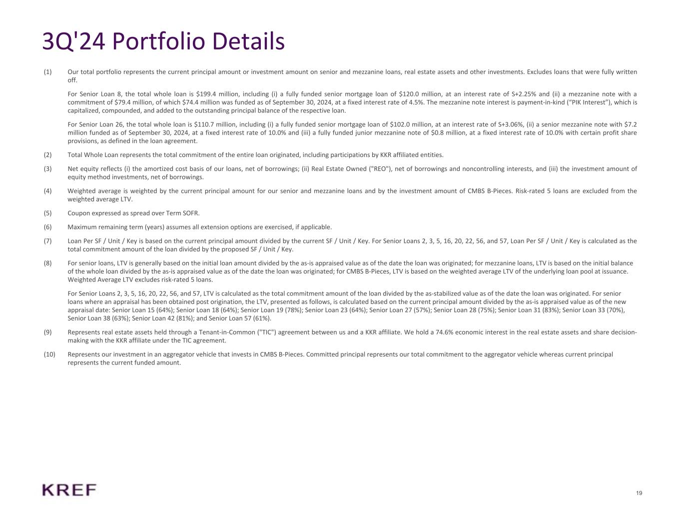 18 3Q'24 Portfolio Details *See footnotes on subsequent page ($ in Millions) # Investment(1) Location Property Type Investment Date Total Whole Loan(2) Committed Principal / Investment Amount(2) Outstanding Principal / Investment Amount Net Equity(3) Coupon(4)(5) Max Remaining Term (Yrs)(4)(6) Loan / Investment Per SF / Unit / Key(7) Origination LTV(4)(8) Risk Rating Senior Loans 51 Senior Loan Reno, NV Industrial 4/28/2022 $140.4 $50.5 $50.5 $11.5 +2.7% 2.6 $117 / SF 74% 3 52 Senior Loan Dallas, TX Multifamily 4/1/2022 43.9 43.9 42.6 11.7 +2.9% 2.5 $119,706 / unit 73% 3 53 Senior Loan Carrollton, TX Multifamily 4/1/2022 43.7 43.7 43.7 13.4 +0.9% 2.9 $136,478 / unit 74% 3 54 Senior Loan San Diego, CA Multifamily 4/29/2022 203.0 40.0 39.7 6.3 +2.6% 2.6 $455,574 / unit 63% 3 55 Senior Loan Georgetown, TX Multifamily 12/16/2021 35.2 35.2 35.2 8.8 +3.4% 2.3 $167,381 / unit 68% 3 56 Senior Loan Various Industrial 6/30/2021 50.2 25.1 22.6 11.2 +5.5% 1.8 $53 / SF 53% 3 57 Senior Loan Denver, CO Industrial 12/11/2020 15.4 15.4 12.7 5.0 +3.8% 1.3 $47 / SF 76% 2 Total / Weighted Average $9,496.6 $6,848.6 $6,339.7 $1,567.2 +3.2% 2.2 65% 3.2 Real Estate Assets 1 Real Estate Owned Mountain View, CA Office 6/28/2024 n.a. $120.6 $120.6 $120.6 n.a. n.a. $393 / SF n.a. n.a. 2 Real Estate Owned Portland, OR Retail / Redevelopment 12/16/2021 n.a. 87.7 87.7 87.7 n.a. n.a. n.a. n.a. n.a. 3 Equity Method Investment(9) Seattle, WA Life Science 6/28/2024 n.a. 81.5 81.5 40.5 n.a. n.a. $520 / SF n.a. n.a. 4 Real Estate Owned Philadelphia, PA Office / Garage 12/22/2023 n.a. 45.8 45.8 15.4 n.a. n.a. $114 / SF n.a. n.a. Total / Weighted Average $335.6 $335.6 $264.2 Other Investments 1 CMBS B-Pieces(10) Various Various 2/13/2017 n.a. 40.0 35.4 35.4 4.8% 4.7 n.a. 58% n.a. Total / Weighted Average $40.0 $35.4 $35.4 4.8% 4.7 58% Portfolio Total / Weighted Average $7,224.2 $6,710.7 $1,866.8 8.1% 2.2 65% 3.2